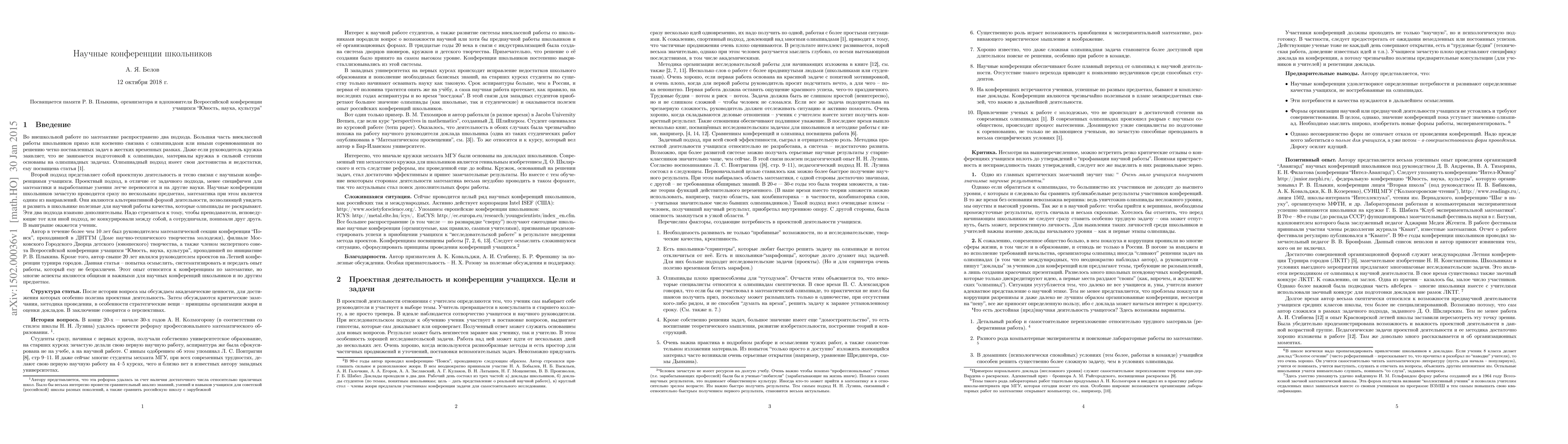 Summary: The paper explores the phenomenon of high school student mathematics conferences, examining both the myths surrounding these events and the actual academic benefits they provide for talented students, supported by a grant from RFFI.