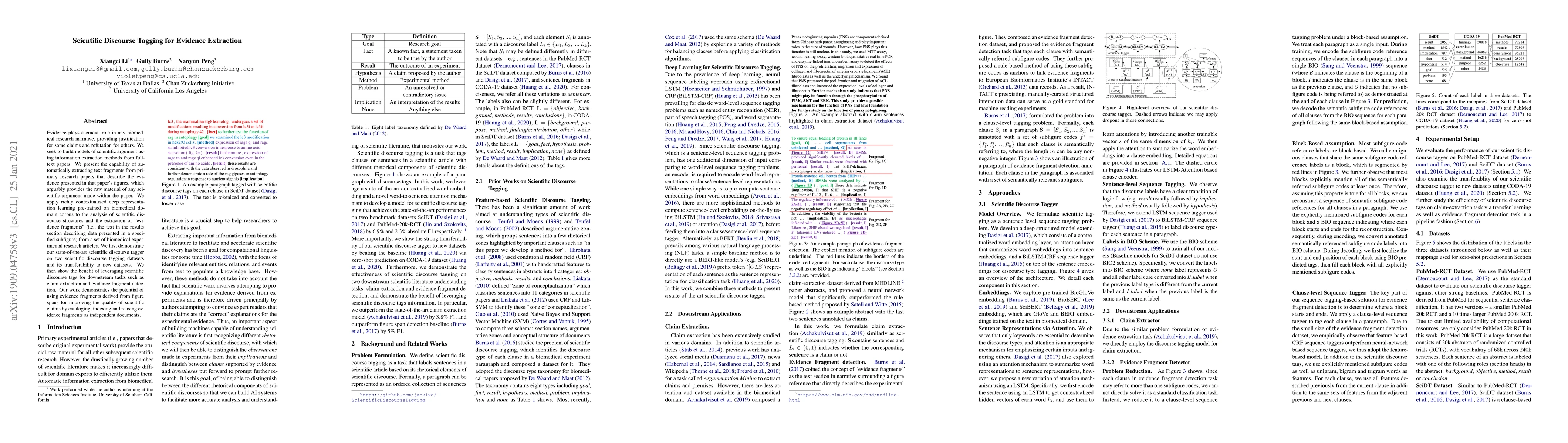 Evidence plays a crucial role in any biomedical research narrative, providing justification for some claims and refutation for others. We seek to build models of scientific argument using information extraction methods from full-text papers. We present the capability of automatically extracting text fragments from primary research papers that describe the evidence presented in that paper's figures, which arguably provides the raw material of any scientific argument made within the paper. We apply richly contextualized deep representation learning pre-trained on biomedical domain corpus to the analysis of scientific discourse structures and the extraction of "evidence fragments" (i.e., the text in the results section describing data presented in a specified subfigure) from a set of biomedical experimental research articles. We first demonstrate our state-of-the-art scientific discourse tagger on two scientific discourse tagging datasets and its transferability to new datasets. We then show the benefit of leveraging scientific discourse tags for downstream tasks such as claim-extraction and evidence fragment detection. Our work demonstrates the potential of using evidence fragments derived from figure spans for improving the quality of scientific claims by cataloging, indexing and reusing evidence fragments as independent documents.