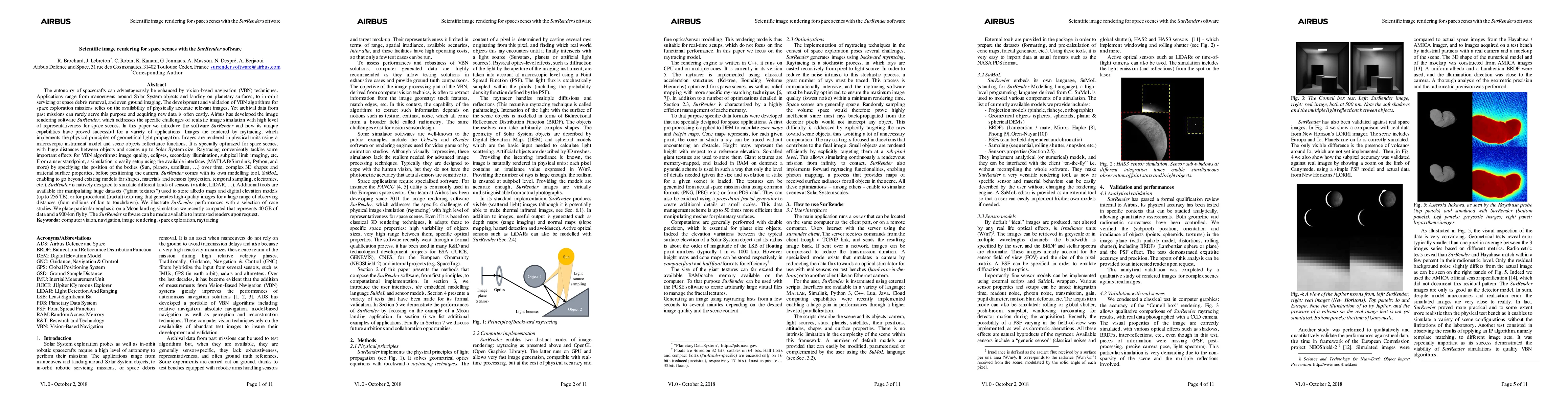 Spacecraft autonomy can be enhanced by vision-based navigation (VBN) techniques. Applications range from manoeuvers around Solar System objects and landing on planetary surfaces, to in-orbit servicing or space debris removal. The development and validation of VBN algorithms relies on the availability of physically accurate relevant images. Yet archival data from past missions can rarely serve this purpose and acquiring new data is often costly. The SurRender software is an image simulator that addresses the challenges of realistic image rendering, with high representativeness for space scenes. Images are rendered by raytracing, which implements the physical principles of geometrical light propagation, in physical units. A macroscopic instrument model and scene objects reflectance functions are used. SurRender is specially optimized for space scenes, with huge distances between objects and scenes up to Solar System size. Raytracing conveniently tackles some important effects for VBN algorithms: image quality, eclipses, secondary illumination, subpixel limb imaging, etc. A simulation is easily setup (in MATLAB, Python, and more) by specifying the position of the bodies (camera, Sun, planets, satellites) over time, 3D shapes and material surface properties. SurRender comes with its own modelling tool enabling to go beyond existing models for shapes, materials and sensors (projection, temporal sampling, electronics, etc.). It is natively designed to simulate different kinds of sensors (visible, LIDAR, etc.). Tools are available for manipulating huge datasets to store albedo maps and digital elevation models, or for procedural (fractal) texturing that generates high-quality images for a large range of observing distances (from millions of km to touchdown). We illustrate SurRender performances with a selection of case studies, placing particular emphasis on a 900-km Moon flyby simulation.