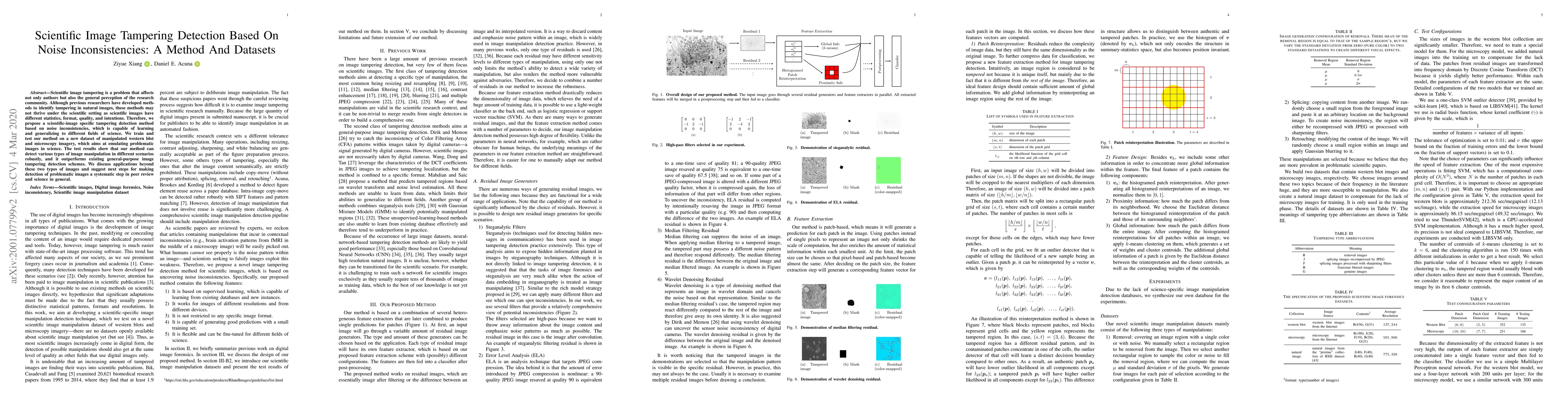 The research proposes a scientific image tampering detection method based on noise inconsistencies, using a patch-based feature extraction technique and residual images. It's trained and tested on a new dataset of manipulated western blot and microscopy imagery.