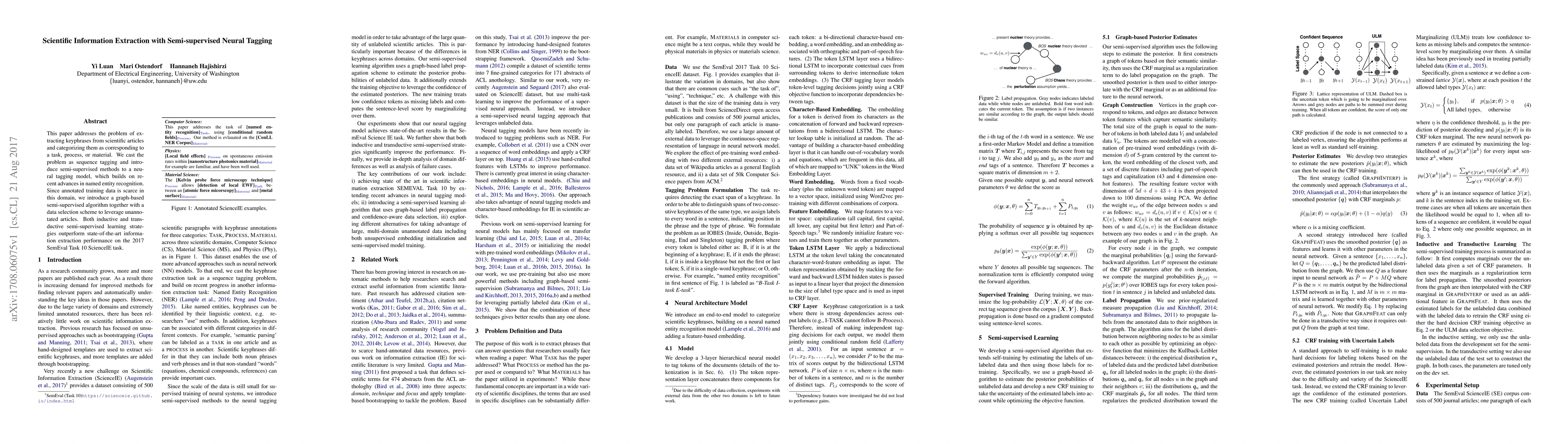 This paper addresses the problem of extracting keyphrases from scientific articles and categorizing them as corresponding to a task, process, or material. We cast the problem as sequence tagging and introduce semi-supervised methods to a neural tagging model, which builds on recent advances in named entity recognition. Since annotated training data is scarce in this domain, we introduce a graph-based semi-supervised algorithm together with a data selection scheme to leverage unannotated articles. Both inductive and transductive semi-supervised learning strategies outperform state-of-the-art information extraction performance on the 2017 SemEval Task 10 ScienceIE task.