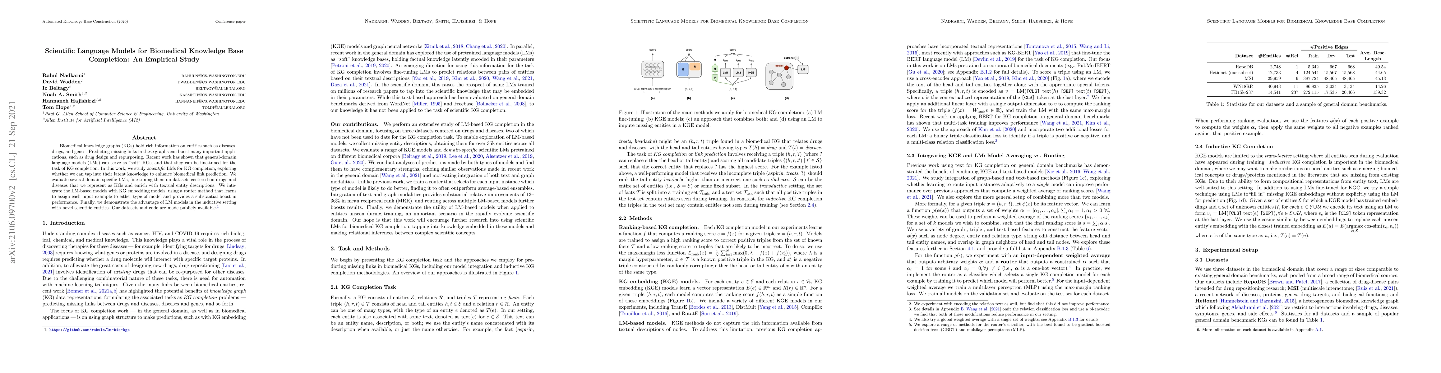 Biomedical knowledge graphs (KGs) hold rich information on entities such as diseases, drugs, and genes. Predicting missing links in these graphs can boost many important applications, such as drug design and repurposing. Recent work has shown that general-domain language models (LMs) can serve as "soft" KGs, and that they can be fine-tuned for the task of KG completion. In this work, we study scientific LMs for KG completion, exploring whether we can tap into their latent knowledge to enhance biomedical link prediction. We evaluate several domain-specific LMs, fine-tuning them on datasets centered on drugs and diseases that we represent as KGs and enrich with textual entity descriptions. We integrate the LM-based models with KG embedding models, using a router method that learns to assign each input example to either type of model and provides a substantial boost in performance. Finally, we demonstrate the advantage of LM models in the inductive setting with novel scientific entities. Our datasets and code are made publicly available.