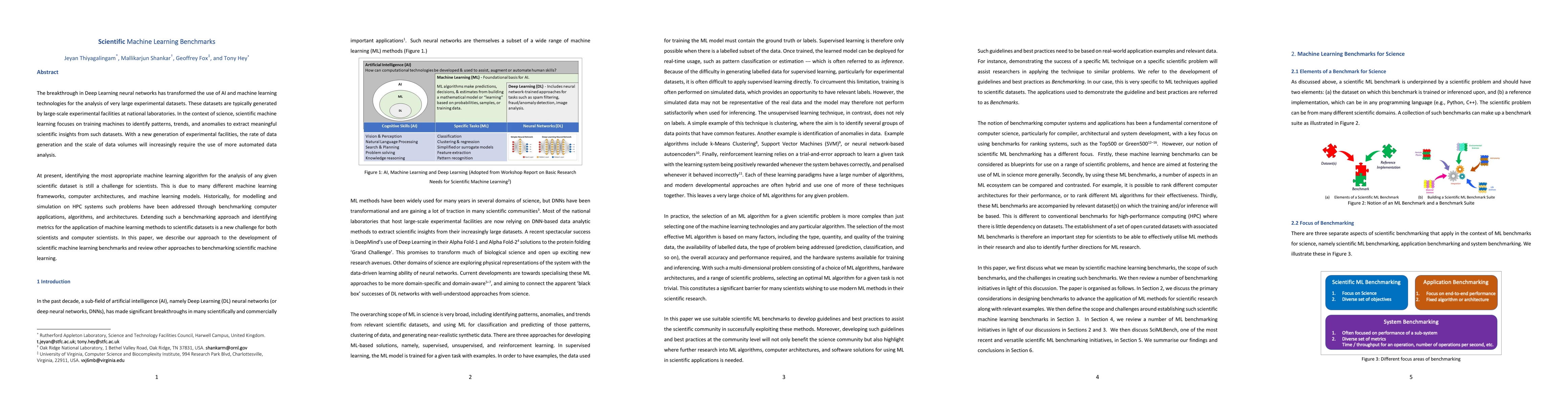 This paper explores the development of benchmarks for scientific machine learning to identify the most effective algorithms for analyzing large experimental datasets. It emphasizes the need for standardized metrics to evaluate machine learning methods in the context of scientific data analysis.