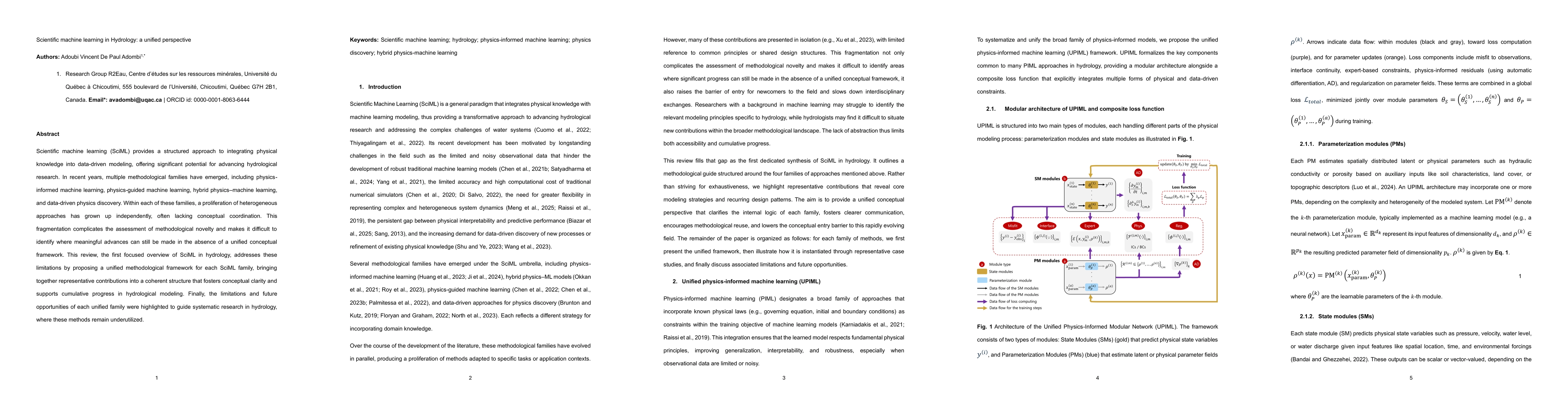 Scientific machine learning (SciML) provides a structured approach to integrating physical knowledge into data-driven modeling, offering significant potential for advancing hydrological research. In recent years, multiple methodological families have emerged, including physics-informed machine learning, physics-guided machine learning, hybrid physics-machine learning, and data-driven physics discovery. Within each of these families, a proliferation of heterogeneous approaches has developed independently, often without conceptual coordination. This fragmentation complicates the assessment of methodological novelty and makes it difficult to identify where meaningful advances can still be made in the absence of a unified conceptual framework. This review, the first focused overview of SciML in hydrology, addresses these limitations by proposing a unified methodological framework for each SciML family, bringing together representative contributions into a coherent structure that fosters conceptual clarity and supports cumulative progress in hydrological modeling. Finally, we highlight the limitations and future opportunities of each unified family to guide systematic research in hydrology, where these methods remain underutilized.