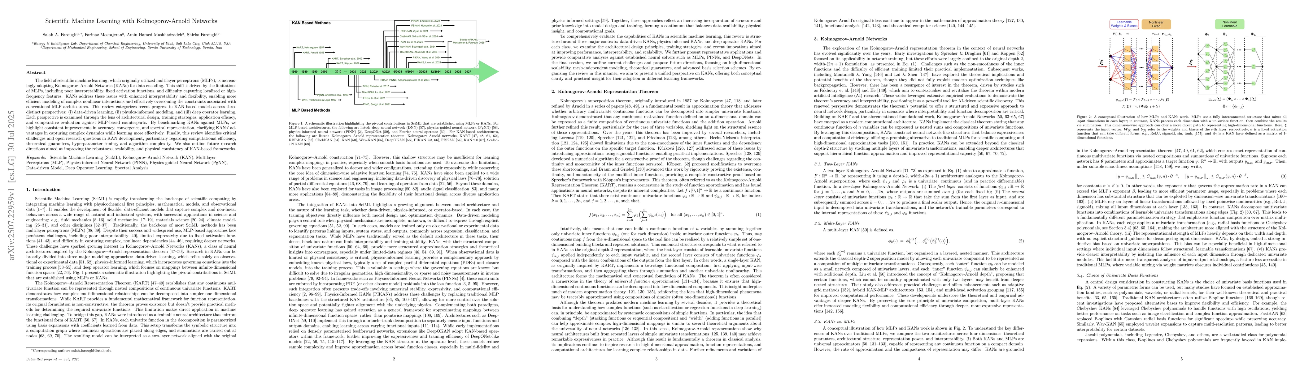 The field of scientific machine learning, which originally utilized multilayer perceptrons (MLPs), is increasingly adopting Kolmogorov-Arnold Networks (KANs) for data encoding. This shift is driven by the limitations of MLPs, including poor interpretability, fixed activation functions, and difficulty capturing localized or high-frequency features. KANs address these issues with enhanced interpretability and flexibility, enabling more efficient modeling of complex nonlinear interactions and effectively overcoming the constraints associated with conventional MLP architectures. This review categorizes recent progress in KAN-based models across three distinct perspectives: (i) data-driven learning, (ii) physics-informed modeling, and (iii) deep operator learning. Each perspective is examined through the lens of architectural design, training strategies, application efficacy, and comparative evaluation against MLP-based counterparts. By benchmarking KANs against MLPs, we highlight consistent improvements in accuracy, convergence, and spectral representation, clarifying KANs' advantages in capturing complex dynamics while learning more effectively. Finally, this review identifies critical challenges and open research questions in KAN development, particularly regarding computational efficiency, theoretical guarantees, hyperparameter tuning, and algorithm complexity. We also outline future research directions aimed at improving the robustness, scalability, and physical consistency of KAN-based frameworks.