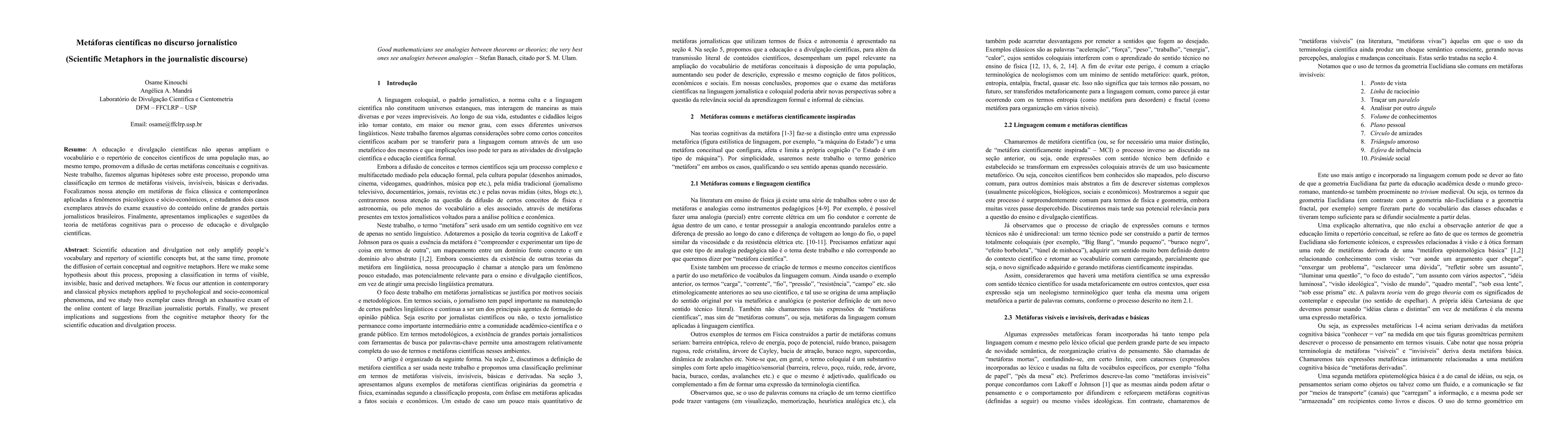 This paper explores how scientific metaphors influence journalistic discourse, classifying them into visible, invisible, basic, and derived types. It examines the application of contemporary and classical physics metaphors in explaining psychological and socio-economic phenomena, analyzing large Brazilian journalistic portals for examples, and discusses implications for scientific education and communication.