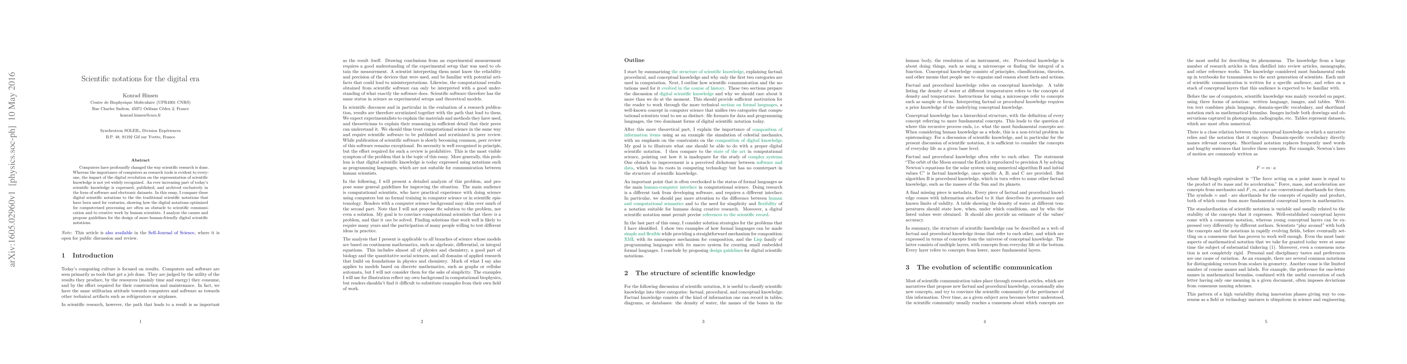This paper examines the impact of digital scientific notations, contrasting them with traditional methods, and argues that while computers revolutionize research, current digital formats can hinder human understanding and creativity. The author proposes guidelines for developing more accessible digital scientific notations.