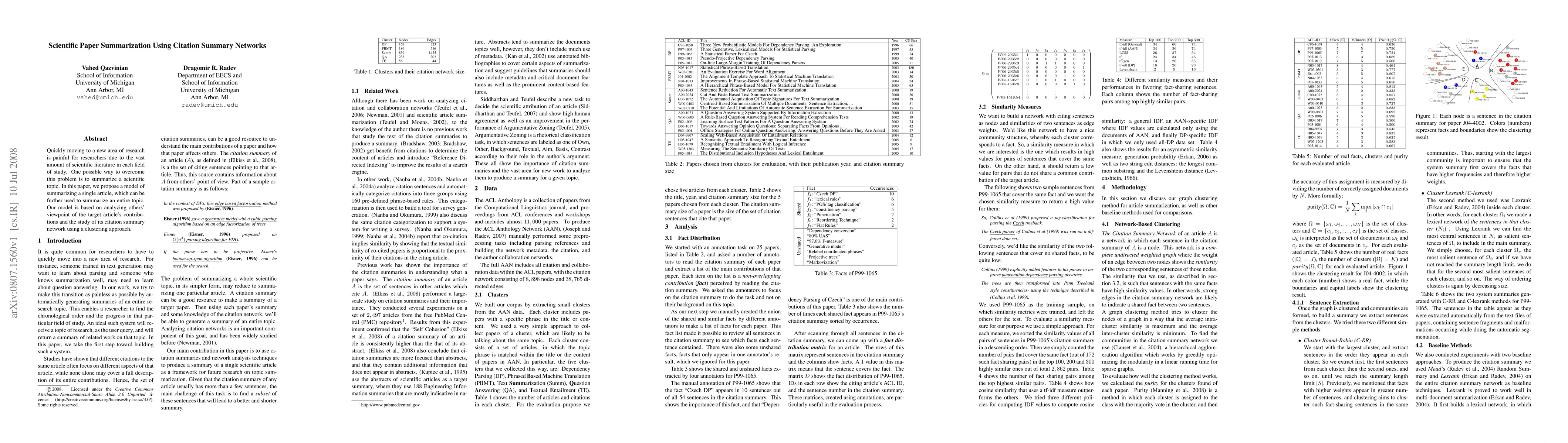Quickly moving to a new area of research is painful for researchers due to the vast amount of scientific literature in each field of study. One possible way to overcome this problem is to summarize a scientific topic. In this paper, we propose a model of summarizing a single article, which can be further used to summarize an entire topic. Our model is based on analyzing others' viewpoint of the target article's contributions and the study of its citation summary network using a clustering approach.