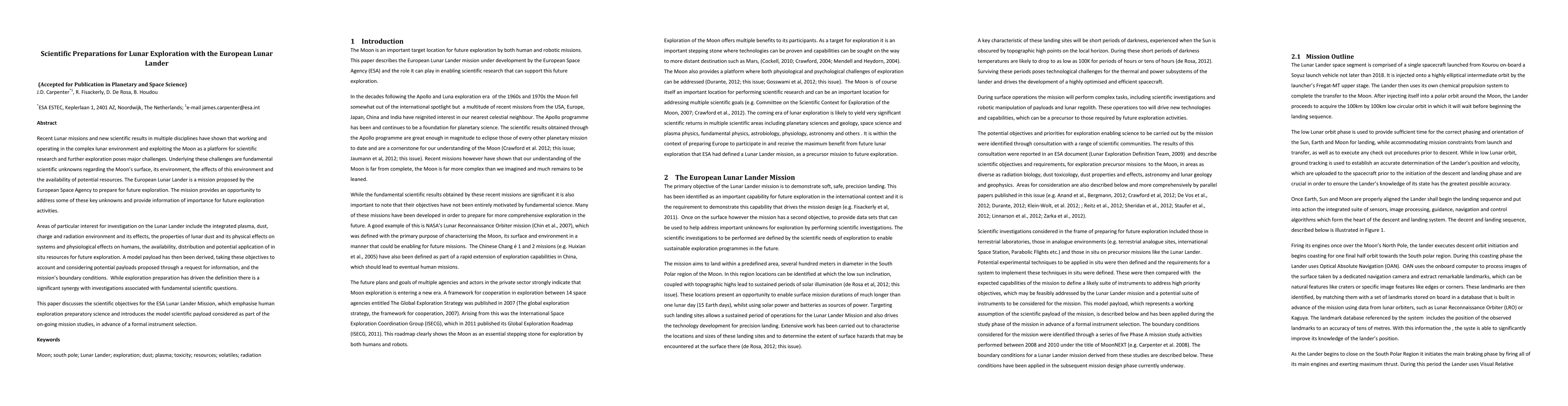 This paper outlines the scientific goals for the ESA Lunar Lander Mission, focusing on preparatory science for human exploration and presents a proposed scientific payload under current mission studies, prior to official instrument selection.