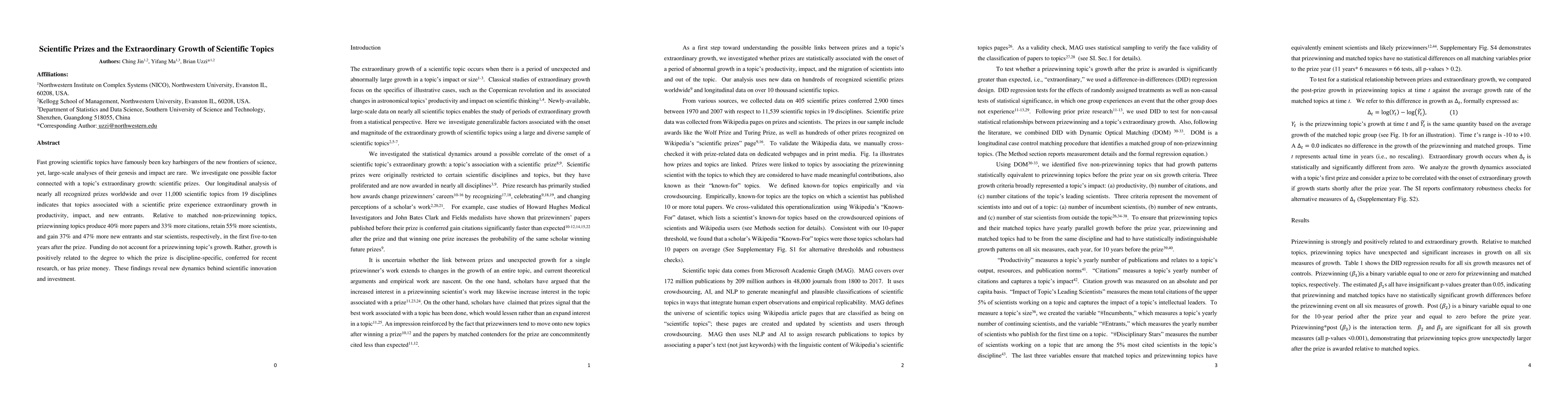 This paper examines how scientific prizes influence the growth of scientific topics, finding that prizewinning topics experience significant increases in productivity, citations, and new entrants. The growth is not attributable to funding but rather linked to the specificity, recency, and monetary value of the prize.