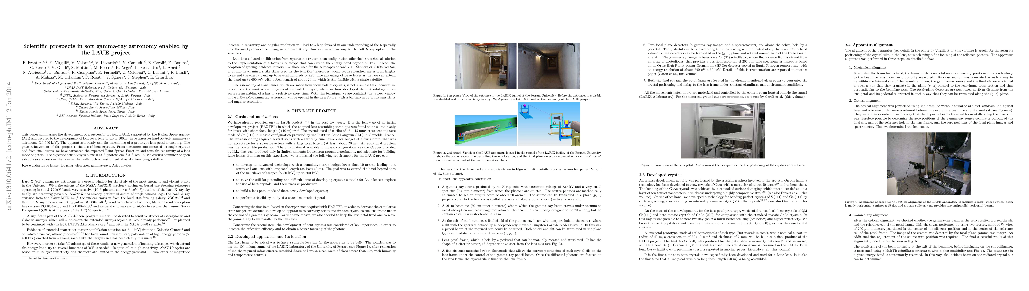 This paper summarizes the development of a successful project, LAUE, supported by the Italian Space Agency (ASI) and devoted to the development of long focal length (up to 100 m) Laue lenses for hard X--/soft gamma--ray astronomy (80-600 keV). The apparatus is ready and the assembling of a prototype lens petal is ongoing. The great achievement of this project is the use of bent crystals. From measurements obtained on single crystals and from simulations, we have estimated the expected Point Spread Function and thus the sensitivity of a lens made of petals. The expected sensitivity is a few $\times10^{-8}$ photons cm$^{-2}$ s$^{-1}$ keV$^{-1}$. We discuss a number of open astrophysical questions that can settled with such an instrument aboard a free-flying satellite.