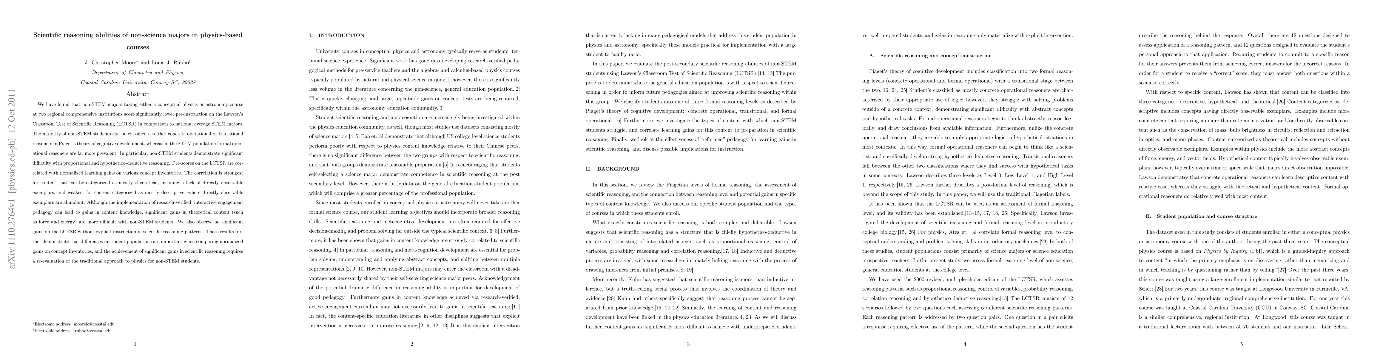 We have found that non-STEM majors taking either a conceptual physics or astronomy course at two regional comprehensive institutions score significantly lower pre-instruction on the Lawson's Classroom Test of Scientific Reasoning (LCTSR) in comparison to national average STEM majors. The majority of non-STEM students can be classified as either concrete operational or transitional reasoners in Piaget's theory of cognitive development, whereas in the STEM population formal operational reasoners are far more prevalent. In particular, non-STEM students demonstrate significant difficulty with proportional and hypothetico-deductive reasoning. Pre-scores on the LCTSR are correlated with normalized learning gains on various concept inventories. The correlation is strongest for content that can be categorized as mostly theoretical, meaning a lack of directly observable exemplars, and weakest for content categorized as mostly descriptive, where directly observable exemplars are abundant. Although the implementation of research-verified, interactive engagement pedagogy can lead to gains in content knowledge, significant gains in theoretical content (such as force and energy) are more difficult with non-STEM students. We also observe no significant gains on the LCTSR without explicit instruction in scientific reasoning patterns. These results further demonstrate that differences in student populations are important when comparing normalized gains on concept inventories, and the achievement of significant gains in scientific reasoning requires a re-evaluation of the traditional approach to physics for non-STEM students.