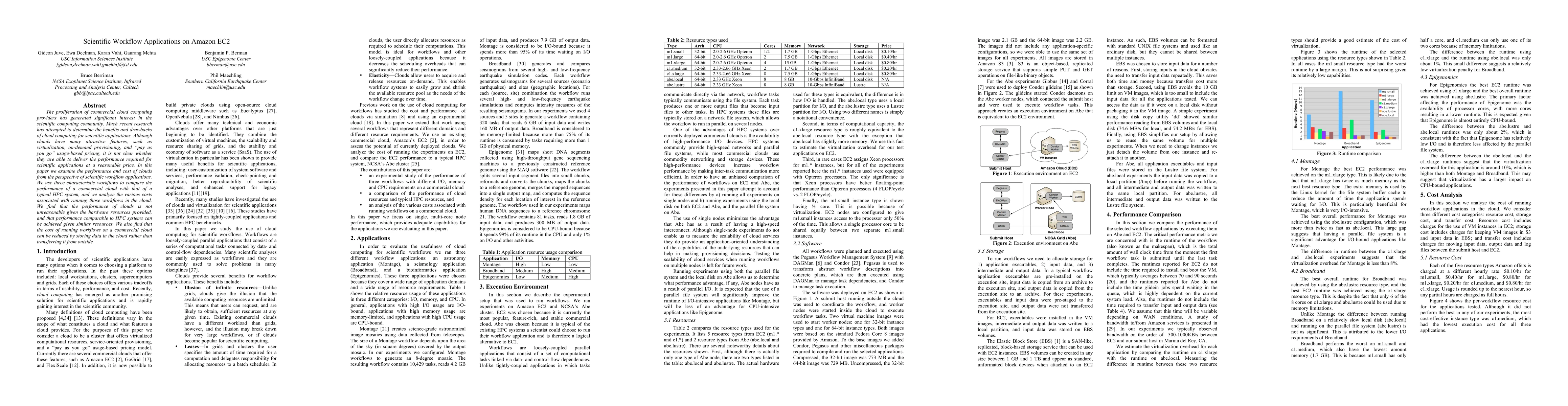 This paper evaluates the performance and cost of Amazon EC2 for scientific workflow applications, comparing it to traditional HPC systems. It finds that cloud performance can match HPC systems with similar resources, and that cloud storage reduces operational costs.