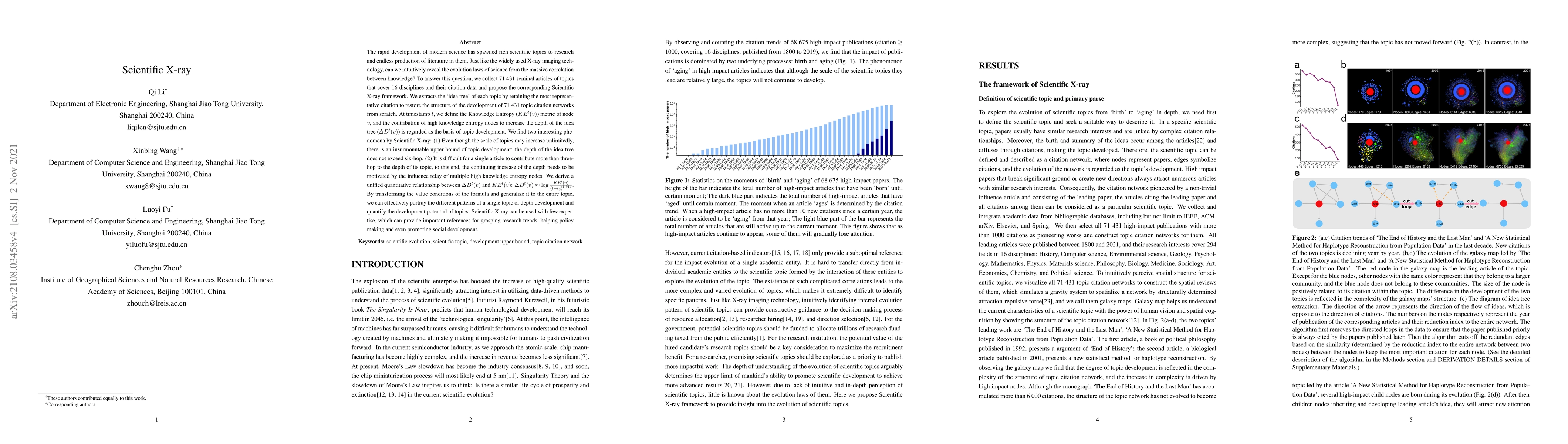 The rapid development of modern science and technology has spawned rich scientific topics to research and endless production of literature in them. Just like X-ray imaging in medicine, can we intuitively identify the development limit and internal evolution pattern of scientific topic from the relationship of massive knowledge? To answer this question, we collect 71431 seminal articles of topics that cover 16 disciplines and their citation data, and extracts the "idea tree" of each topic to restore the structure of the development of 71431 topic networks from scratch. We define the Knowledge Entropy (KE) metric, and the contribution of high knowledge entropy nodes to increase the depth of the idea tree is regarded as the basis for topic development. By observing "X-ray images" of topics, We find two interesting phenomena: (1) Even though the scale of topics may increase unlimitedly, there is an insurmountable cap of topic development: the depth of the idea tree does not exceed 6 jumps, which coincides with the classical "Six Degrees of Separation"! (2) It is difficult for a single article to contribute more than 3 jumps to the depth of its topic, to this end, the continuing increase in the depth of the idea tree needs to be motivated by the influence relay of multiple high knowledge entropy nodes. Through substantial statistical fits, we derive a unified quantitative relationship between the change in topic depth ${\Delta D}^t(v)$ and the change in knowledge entropy over time ${KE}^t\left(v\right)$ of the article $v$ driving the increase in depth in the topic: ${\Delta D}^t(v) \approx \log \frac{KE^{t}(v)}{\left(t-t_{0}\right)^{1.8803}}$ , which can effectively portray evolution patterns of topics and predict their development potential. The various phenomena found by scientific x-ray may provide a new paradigm for explaining and understanding the evolution of science and technology.