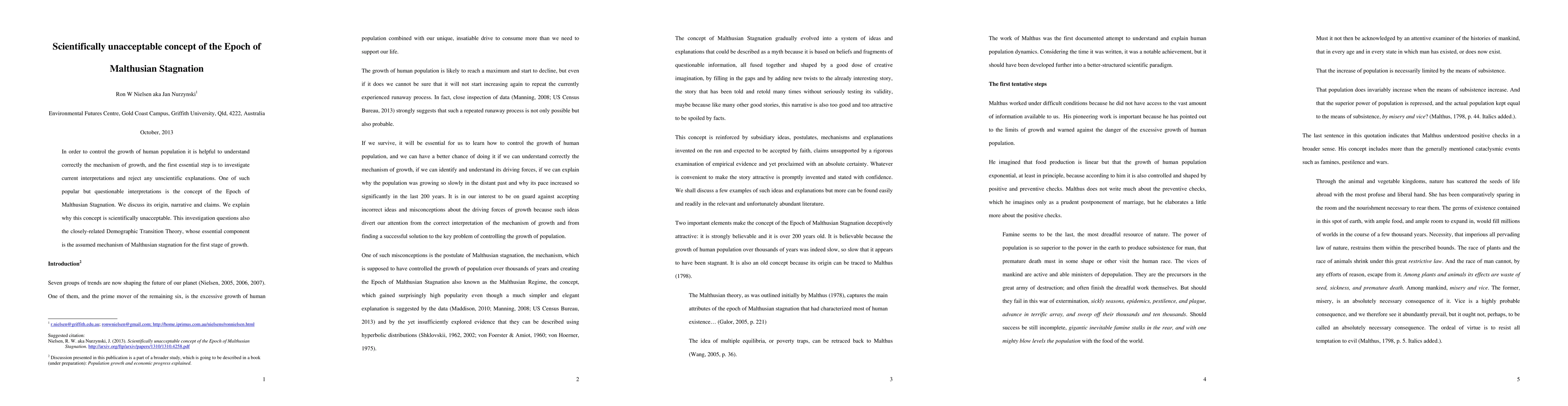 The paper critically analyzes the concept of the Epoch of Malthusian Stagnation, questioning its scientific validity through a review of existing interpretations and theories, including the Demographic Transition Theory.