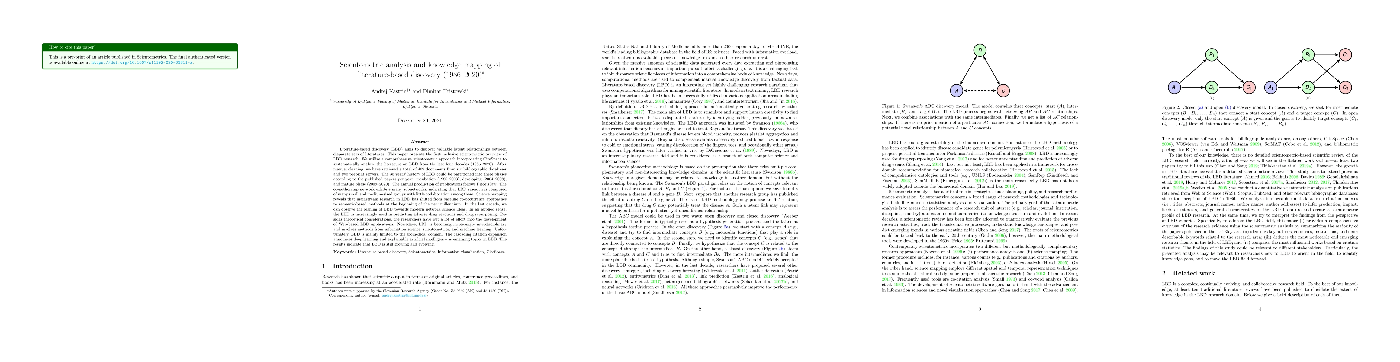 This paper provides a comprehensive scientometric analysis of literature-based discovery (LBD) from 1986 to 2020, identifying three phases of development and noting a shift towards semantic-based methods and interdisciplinary approaches, particularly in biomedical applications. Emerging trends include deep learning and explainable AI.
