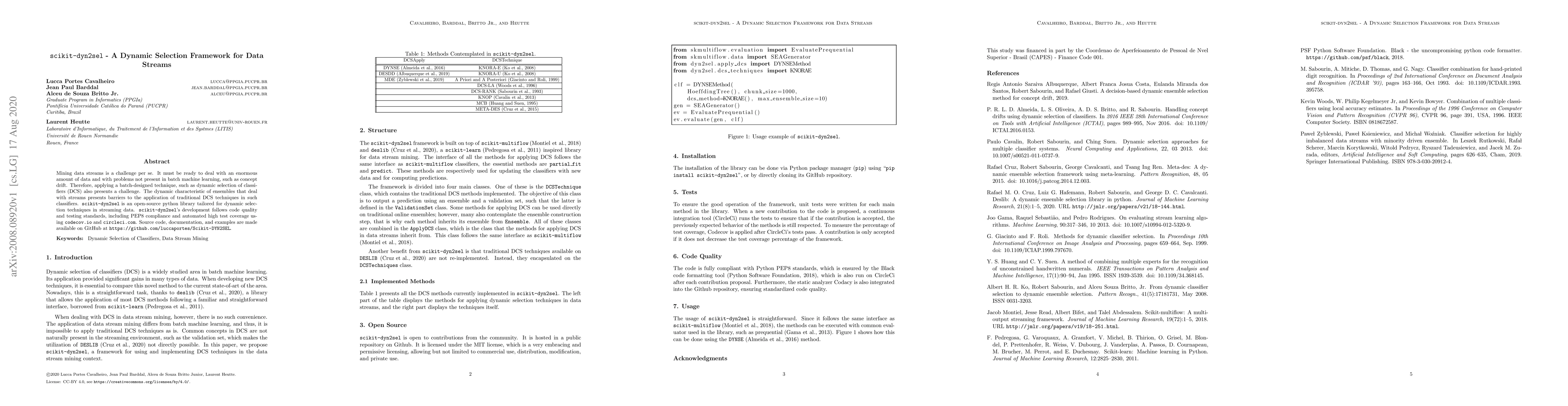 scikit-dyn2sel is an open-source Python library designed for dynamic selection of classifiers in data streams, addressing challenges like concept drift. It adheres to code quality standards and offers high test coverage, with source code and documentation available on GitHub.