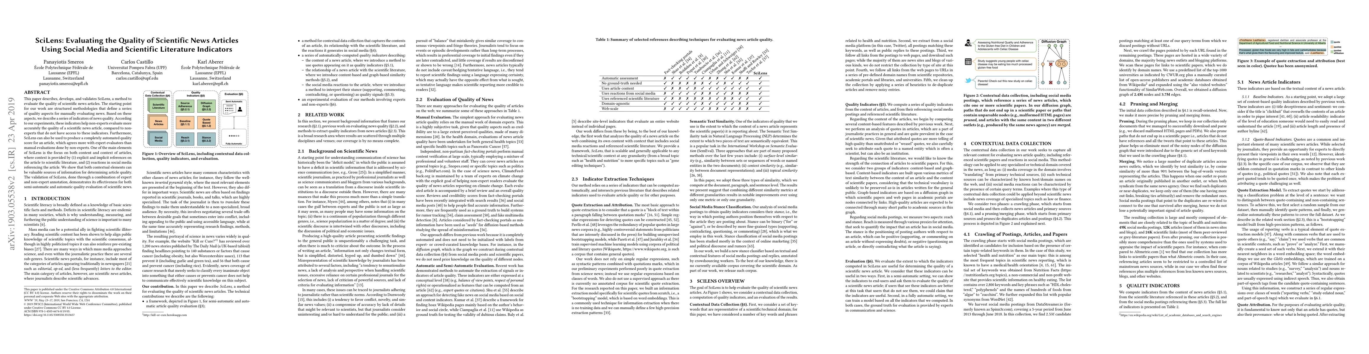 This paper describes, develops, and validates SciLens, a method to evaluate the quality of scientific news articles. The starting point for our work are structured methodologies that define a series of quality aspects for manually evaluating news. Based on these aspects, we describe a series of indicators of news quality. According to our experiments, these indicators help non-experts evaluate more accurately the quality of a scientific news article, compared to non-experts that do not have access to these indicators. Furthermore, SciLens can also be used to produce a completely automated quality score for an article, which agrees more with expert evaluators than manual evaluations done by non-experts. One of the main elements of SciLens is the focus on both content and context of articles, where context is provided by (1) explicit and implicit references on the article to scientific literature, and (2) reactions in social media referencing the article. We show that both contextual elements can be valuable sources of information for determining article quality. The validation of SciLens, done through a combination of expert and non-expert annotation, demonstrates its effectiveness for both semi-automatic and automatic quality evaluation of scientific news.
