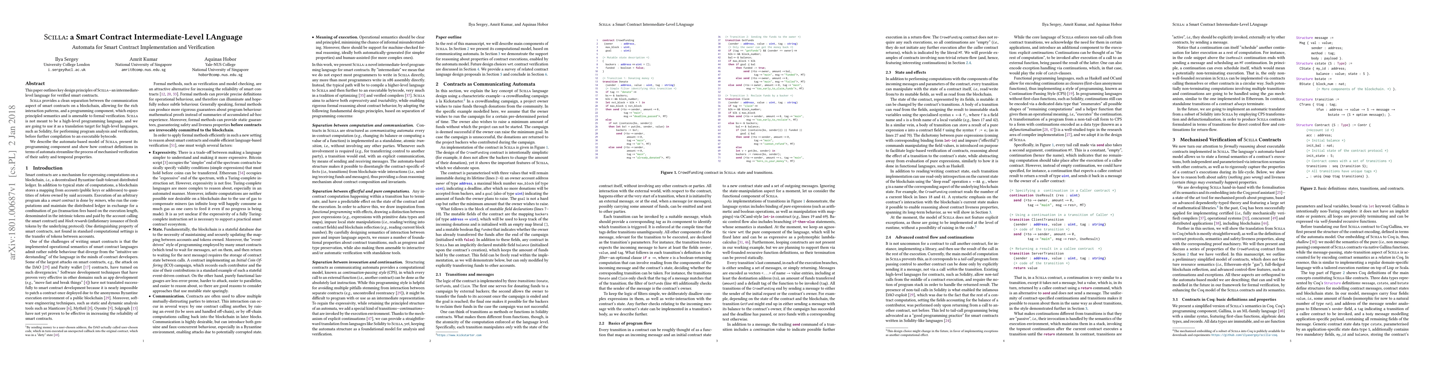 Scilla is an intermediate-level language designed for verified smart contracts, providing a clean separation between communication and programming aspects, and enabling formal verification through an automata-based model. It serves as a translation target for high-level languages like Solidity for mechanized verification before compiling to bytecode.