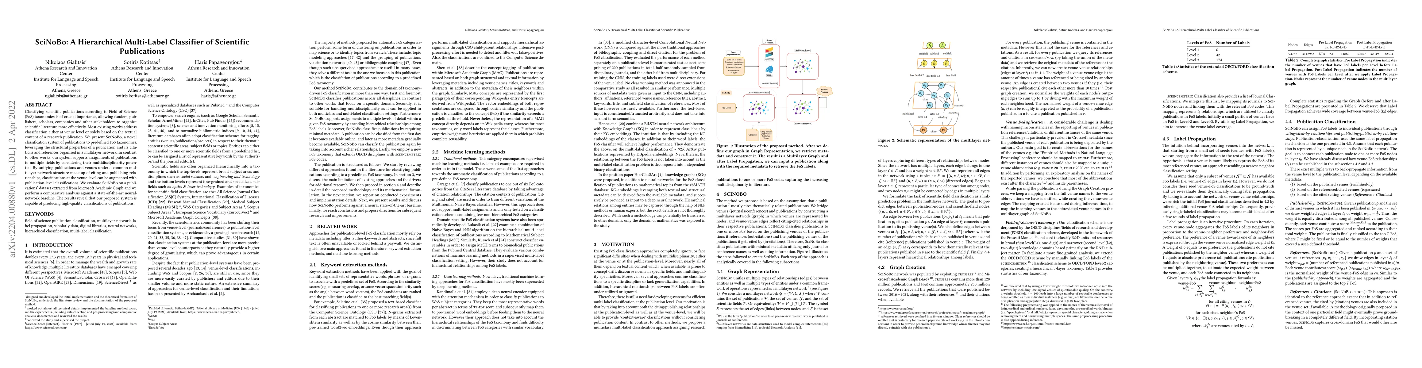 SciNoBo is a hierarchical multi-label classifier for scientific publications that uses a multilayer network structure incorporating publication and citation relationships to classify papers according to Field-of-Science taxonomies. The system supports multidisciplinarity and outperforms a neural-network baseline in classification accuracy.