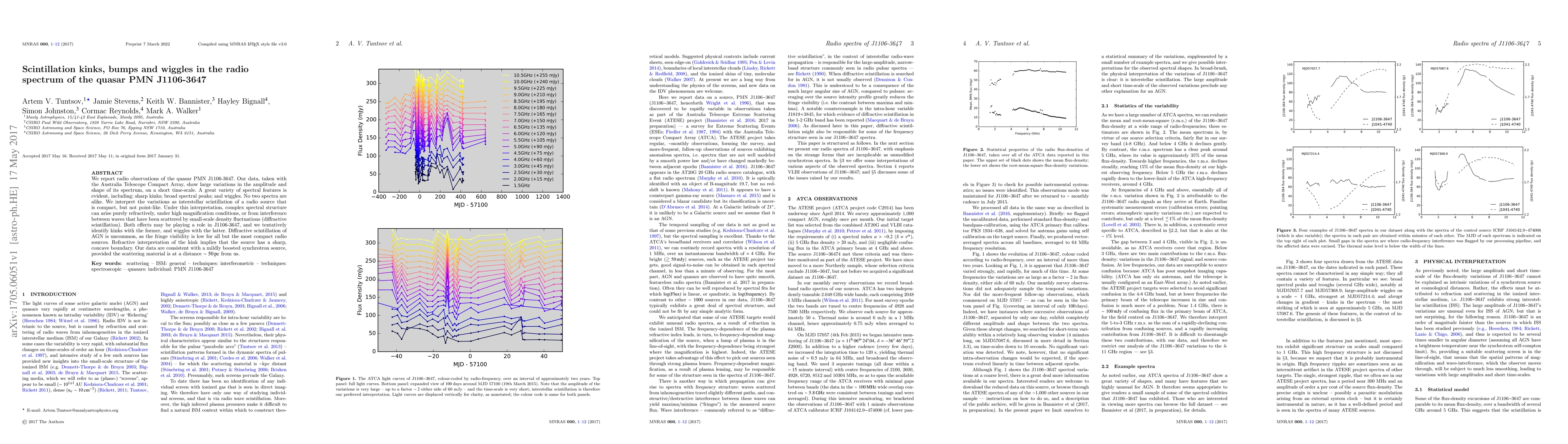 The study of quasar PMN J1106-3647 with the Australia Telescope Compact Array revealed rapid, complex spectral variations including kinks, peaks, and wiggles. These are attributed to interstellar scintillation, possibly from both refractive and diffractive effects, indicating a compact yet non-point-like source. The findings suggest a mildly boosted synchrotron source at approximately 50 pc distance, with potential implications for understanding AGN and scattering material.