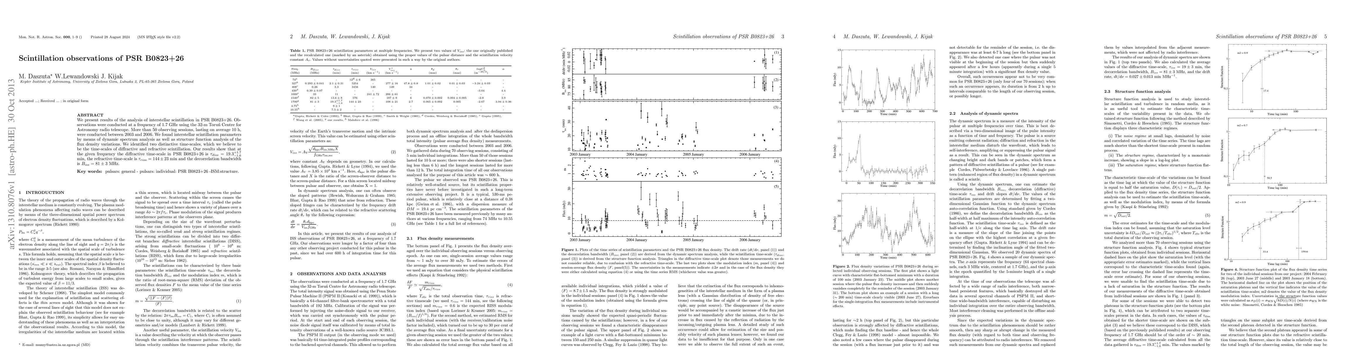 Researchers analyzed PSR B0823+26's interstellar scintillation using dynamic spectrum analysis and structure function analysis, identifying distinctive time-scales for diffractive and refractive scintillation.