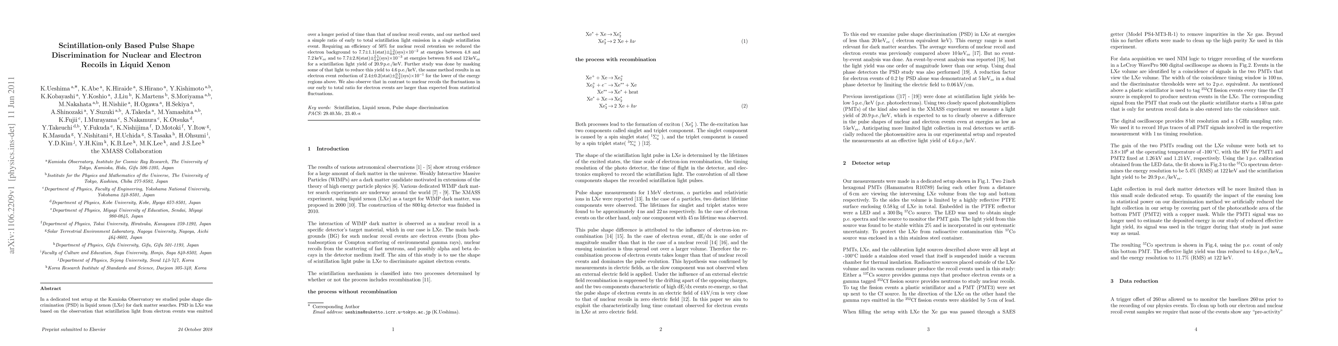 This research investigates pulse shape discrimination in liquid xenon for dark matter detection, utilizing scintillation light emission differences between electron and nuclear recoils. The method achieved a 50% efficiency in nuclear recoil retention, significantly reducing electron background to 7.7×10^-2 at lower energies and 7.7×10^-3 at higher energies, while also noting larger-than-expected fluctuations in electron events' early to total scintillation ratio.