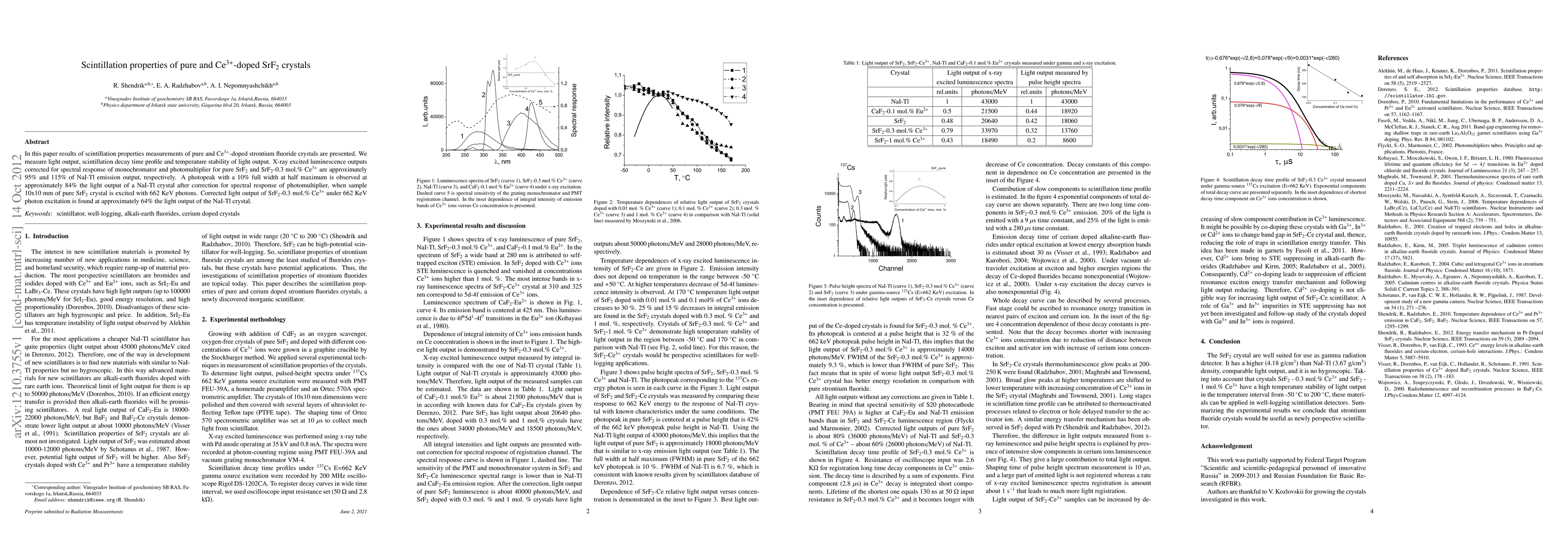 In this paper results of scintillation properties measurements of pure and Ce3+-doped strontium fluoride crystals are presented. We measure light output, scintillation decay time profile and temperature stability of light output. X-ray excited luminescence outputs corrected for spectral response of monochromator and photomultiplier for pure SrF2 and SrF2-0.3 mol.% Ce3+ are approximately 95% and 115% of NaI-Tl emission output, respectively. A photopeak with a 10% full width at half maximum is observed at approximately 84% the light output of a NaI-Tl crystal after correction for spectral response of photomultiplier, when sample 10x10 mm of pure SrF2 crystal is excited with 662 KeV photons. Corrected light output of SrF2-0.3 mol.% Ce3+ under 662 KeV photon excitation is found at approximately 64% the light output of the NaI-Tl crystal.