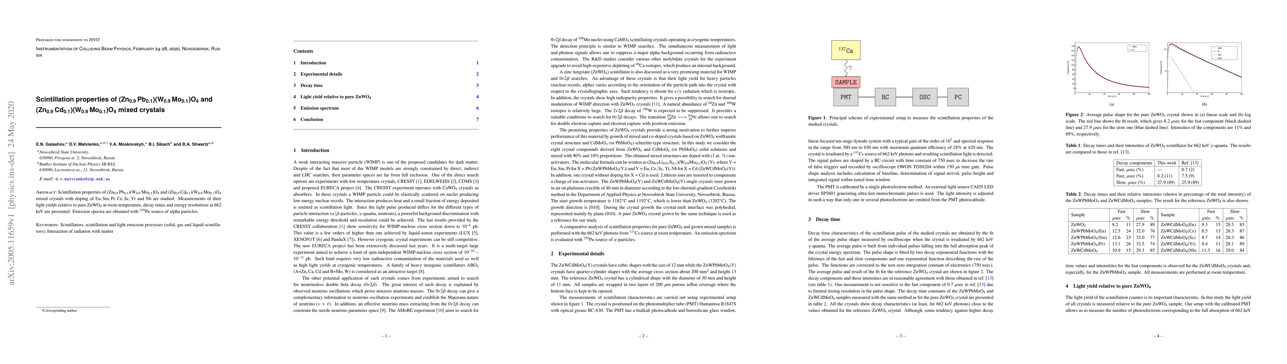 Scintillation properties of $({\rm Zn}_{0.9} {\rm Pb}_{0.1})({\rm W}_{0.9} {\rm Mo}_{0.1}){\rm O}_4$ and $({\rm Zn}_{0.9} {\rm Cd}_{0.1})({\rm W}_{0.9} {\rm Mo}_{0.1}){\rm O}_4$ mixed crystals with doping of ${\rm Eu, Sm, Pr, Ce, Sc, Yt}$ and ${\rm Nb}$ are studied. Measurements of their light yields relative to pure ${\rm ZnWO}_4$ at room temperature, decay times and energy resolutions at 662 keV are presented. Emission spectra are obtained with ${}^{239}Pu$ source of alpha particles.
