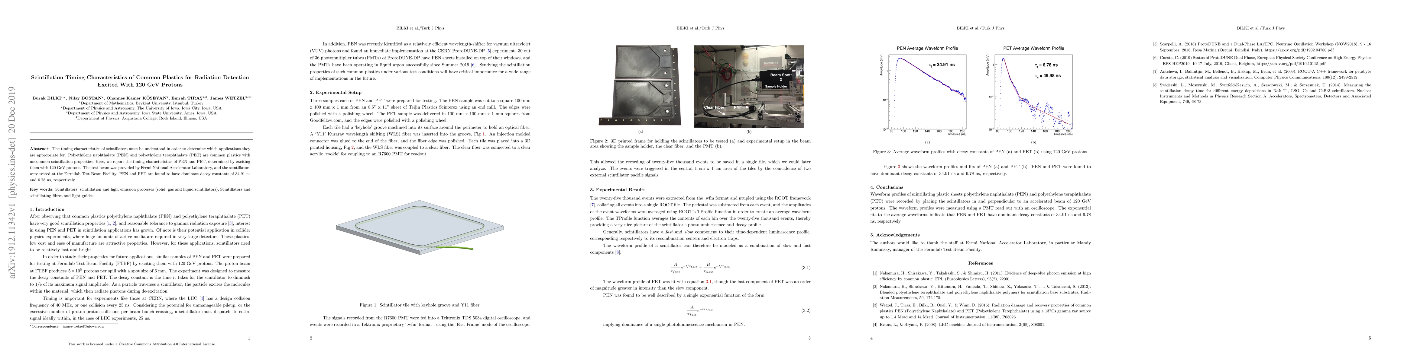 This study investigates the scintillation timing characteristics of polyethylene naphthalate (PEN) and polyethylene teraphthalate (PET) plastics when excited by 120 GeV protons. The research finds PEN has a dominant decay constant of 34.91 ns, while PET has a shorter decay constant of 6.78 ns, indicating different suitability for radiation detection applications.