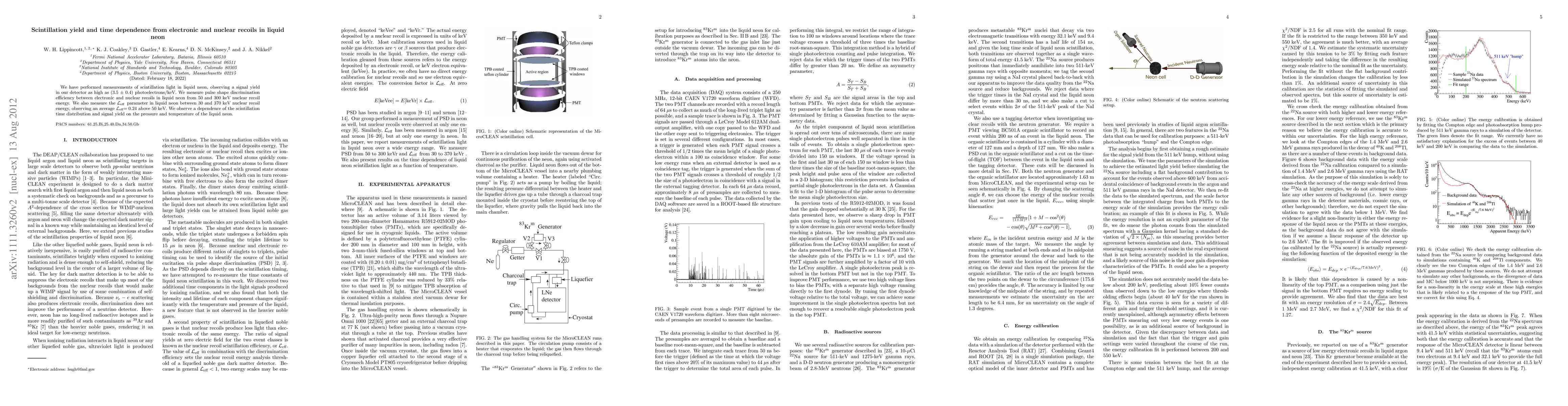 We have performed measurements of scintillation light in liquid neon, observing a signal yield in our detector as high as (3.5 $\pm$ 0.4) photoelectrons/keV. We measure pulse shape discrimination efficiency between electronic and nuclear recoils in liquid neon from 50 and 300 keV nuclear recoil energy. We also measure the \leff\, parameter in liquid neon between 30 and 370 keV nuclear recoil energy, observing an average \leff$=0.24$ above 50 keV. We observe a dependence of the scintillation time distribution and signal yield on the pressure and temperature of the liquid neon.