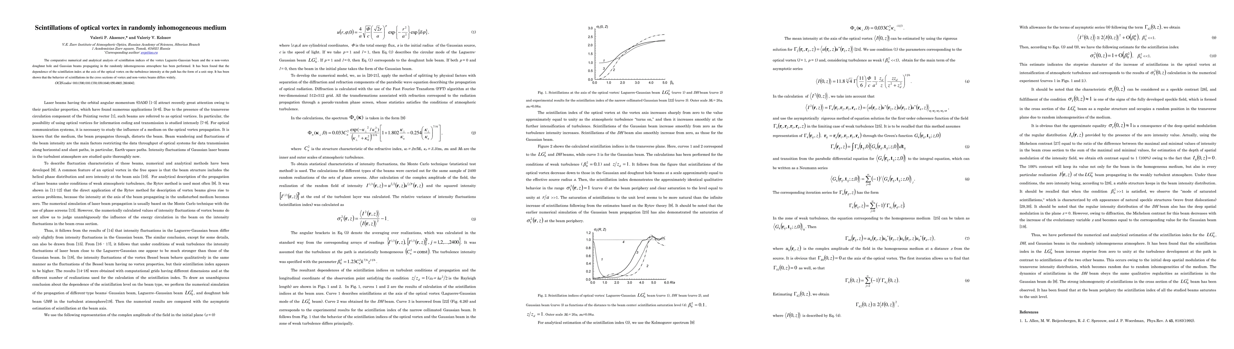 This paper investigates the scintillation behavior of vortex Laguerre-Gaussian beams and non-vortex doughnut and Gaussian beams in a randomly inhomogeneous atmosphere. The study reveals a unit step relationship for scintillation index dependence on turbulence intensity along the optical vortex axis, highlighting significant differences in scintillation behavior between vortex and non-vortex beams.