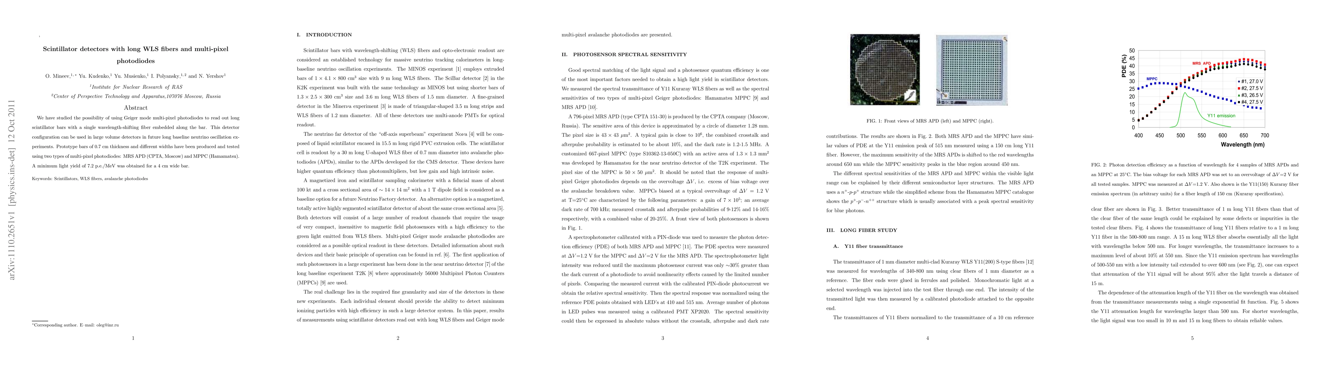 We have studied the possibility of using Geiger mode multi-pixel photodiodes to read out long scintillator bars with a single wavelength-shifting fiber embedded along the bar. This detector configuration can be used in large volume detectors in future long baseline neutrino oscillation experiments. Prototype bars of 0.7 cm thickness and different widths have been produced and tested using two types of multi-pixel photodiodes: MRS APD (CPTA, Moscow) and MPPC (Hamamatsu). A minimum light yield of 7.2 p.e./MeV was obtained for a 4 cm wide bar.