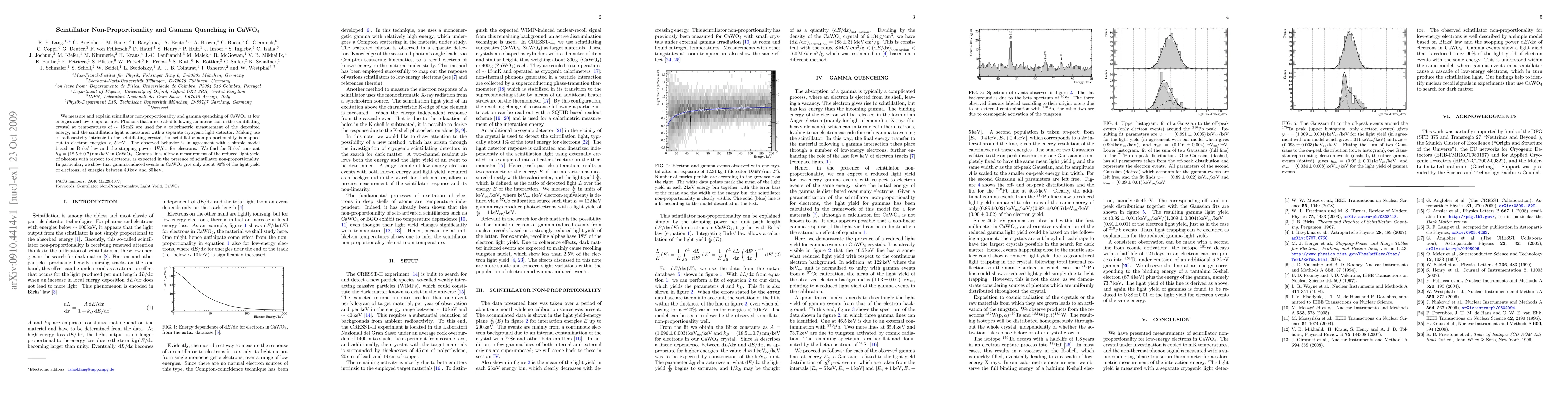 The paper presents a detailed model for scintillator non-proportionality and gamma quenching in CaWO4, utilizing a cryogenic setup for precise measurements.