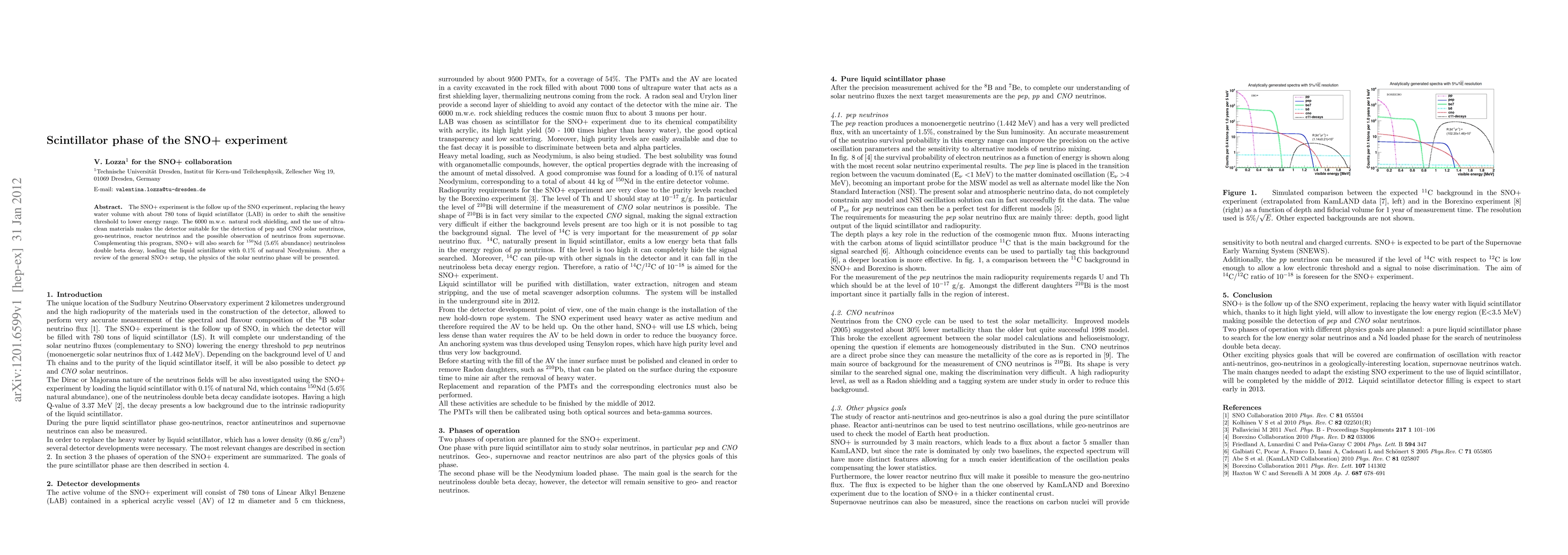 The SNO+ experiment is the follow up of the SNO experiment, replacing the heavy water volume with about 780 tons of liquid scintillator (LAB) in order to shift the sensitive threshold to lower energy range. The 6000 m.w.e. natural rock shielding, and the use of ultra- clean materials makes the detector suitable for the detection of pep and CNO solar neutrinos, geo-neutrinos, reactor neutrinos and the possible observation of neutrinos from supernovae. Complementing this program, SNO+ will also search for 150Nd (5.6% abundance) neutrinoless double beta decay, loading the liquid scintillator with 0.1% of natural Neodymium. After a review of the general SNO+ setup, the physics of the solar neutrino phase will be presented.