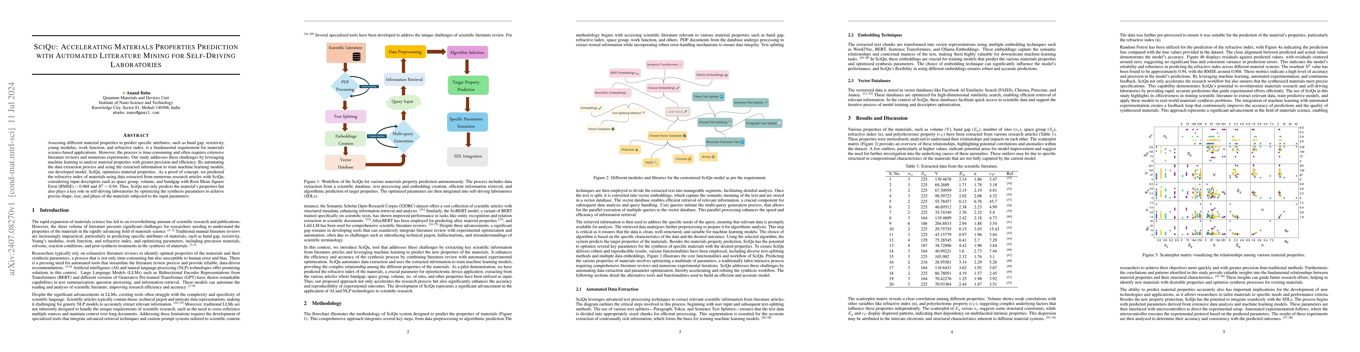 SciQu employs machine learning to automate literature mining and predict material properties like band gap and refractive index efficiently, optimizing material synthesis in self-driving laboratories with high precision. The model achieved a RMSE of 0.068 and R2 of 0.94 in predicting the refractive index.