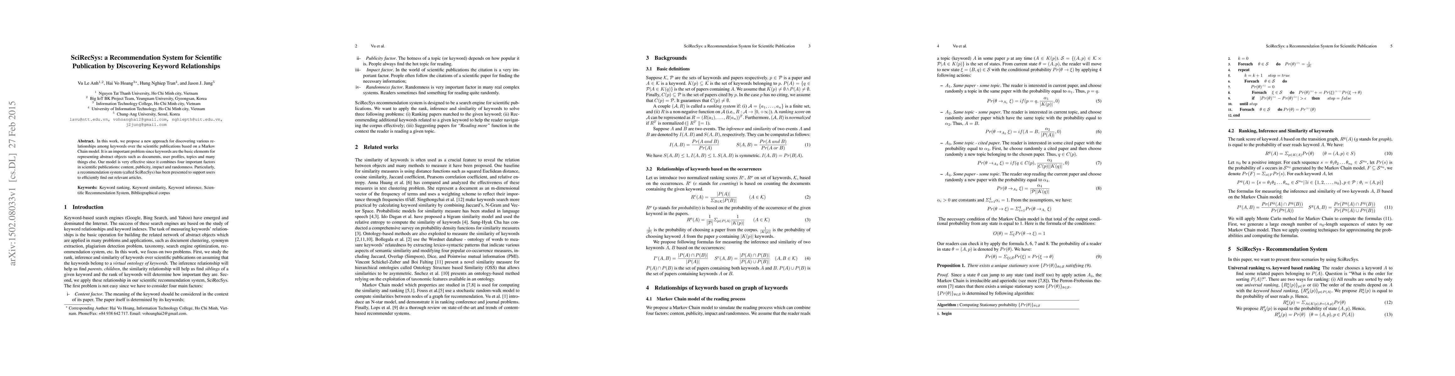 In this work, we propose a new approach for discovering various relationships among keywords over the scientific publications based on a Markov Chain model. It is an important problem since keywords are the basic elements for representing abstract objects such as documents, user profiles, topics and many things else. Our model is very effective since it combines four important factors in scientific publications: content, publicity, impact and randomness. Particularly, a recommendation system (called SciRecSys) has been presented to support users to efficiently find out relevant articles.