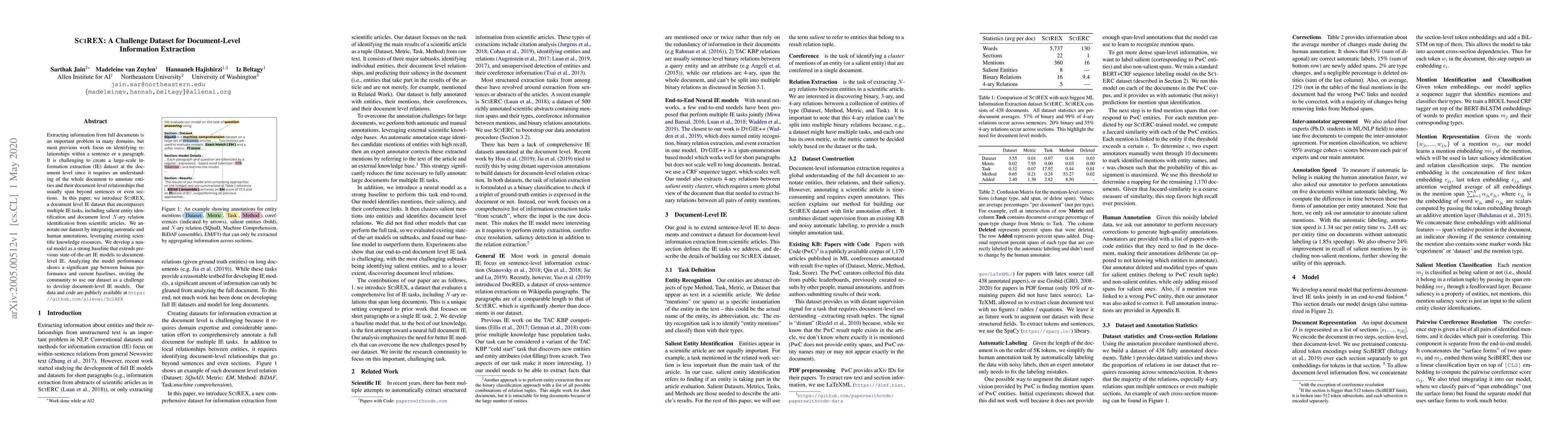 SciREX is a new document-level information extraction dataset designed to tackle challenges in extracting entities and their relationships across entire scientific articles. The dataset aims to spur the development of advanced models for document-level information extraction by providing a benchmark for salient entity and $N$-ary relation identification.