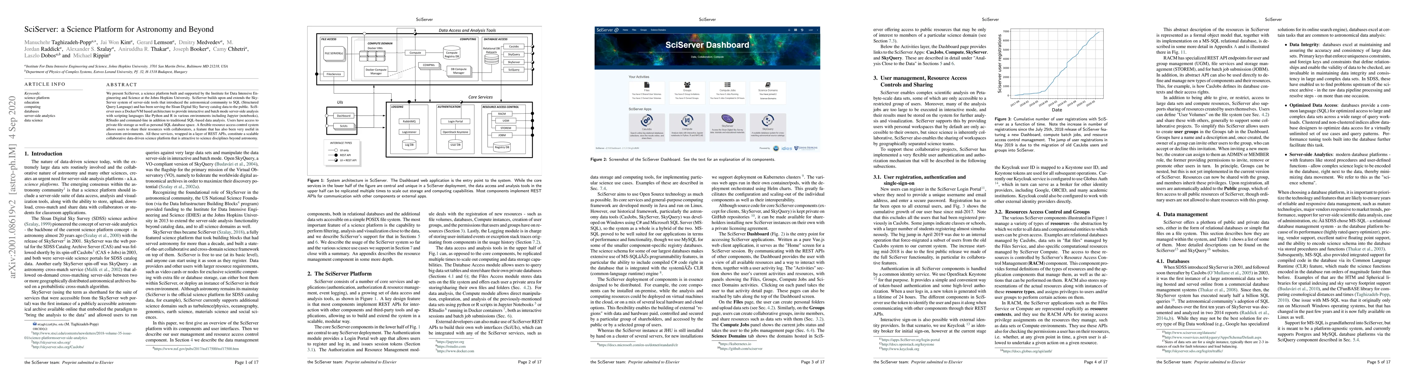 We present SciServer, a science platform built and supported by the Institute for Data Intensive Engineering and Science at the Johns Hopkins University. SciServer builds upon and extends the SkyServer system of server-side tools that introduced the astronomical community to SQL (Structured Query Language) and has been serving the Sloan Digital Sky Survey catalog data to the public. SciServer uses a Docker/VM based architecture to provide interactive and batch mode server-side analysis with scripting languages like Python and R in various environments including Jupyter (notebooks), RStudio and command-line in addition to traditional SQL-based data analysis. Users have access to private file storage as well as personal SQL database space. A flexible resource access control system allows users to share their resources with collaborators, a feature that has also been very useful in classroom environments. All these services, wrapped in a layer of REST APIs, constitute a scalable collaborative data-driven science platform that is attractive to science disciplines beyond astronomy.