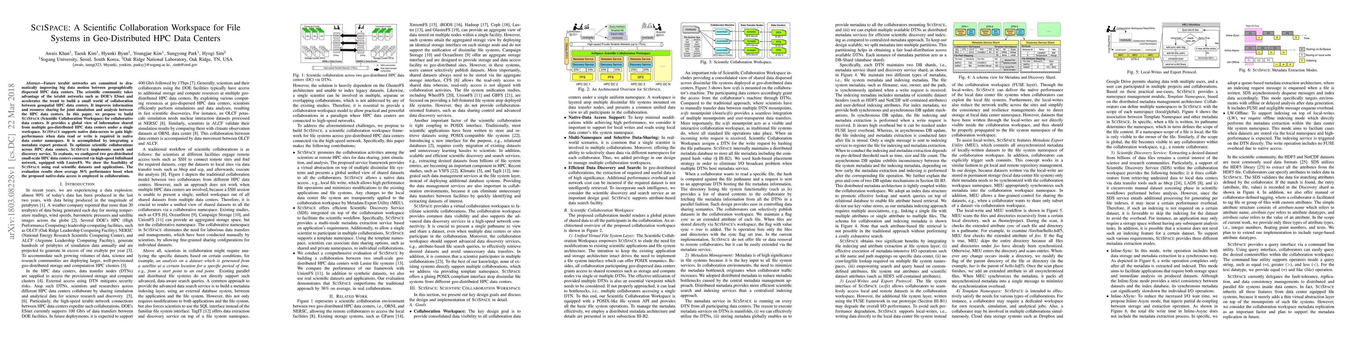 SCISPACE improves scientific collaboration between geospatial HPC data centers by providing a global workspace for information sharing and native data access, resulting in a 36% performance boost.