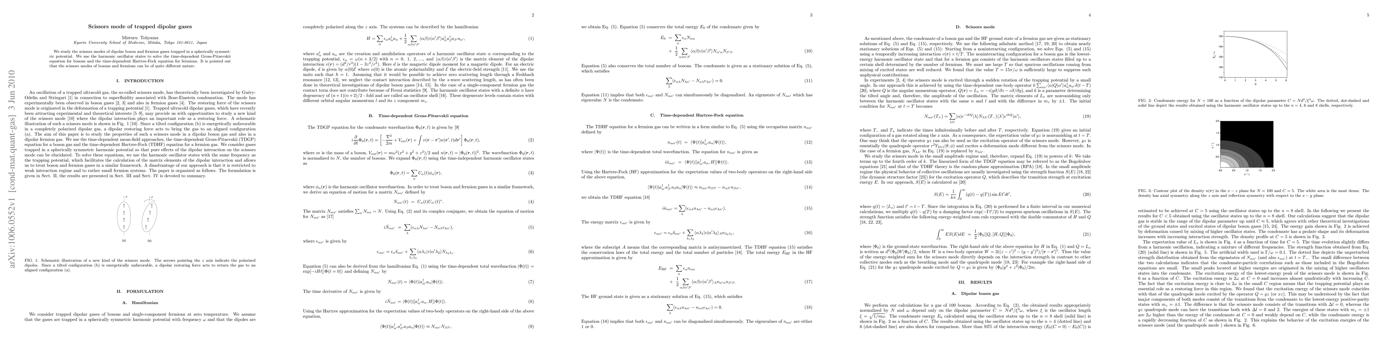 We study the scissors modes of dipolar boson and fermion gases trapped in a spherically symmetric potential. We use the harmonic oscillator states to solve the time-dependent Gross-Pitaevskii equation for bosons and the time-dependent Hartree-Fock equation for fermions. It is pointed out that the scissors modes of bosons and fermions can be of quite different nature.