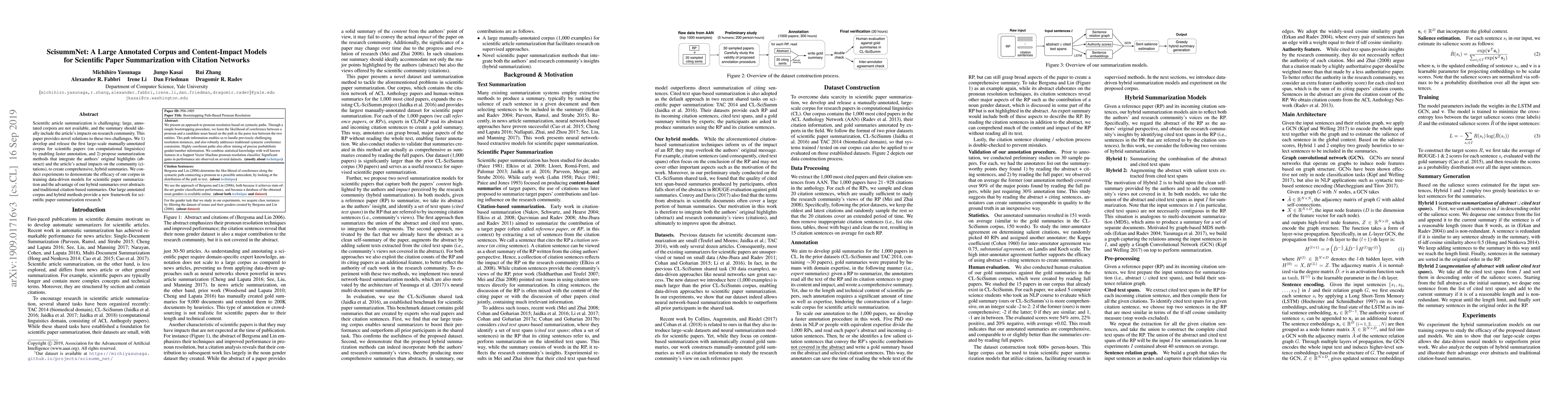 The paper introduces ScisummNet, a large-scale annotated corpus for scientific papers in computational linguistics, and proposes summarization models that combine abstracts and citation impacts. Experiments show the corpus's effectiveness for training summarization models and the superiority of hybrid summaries over traditional methods.