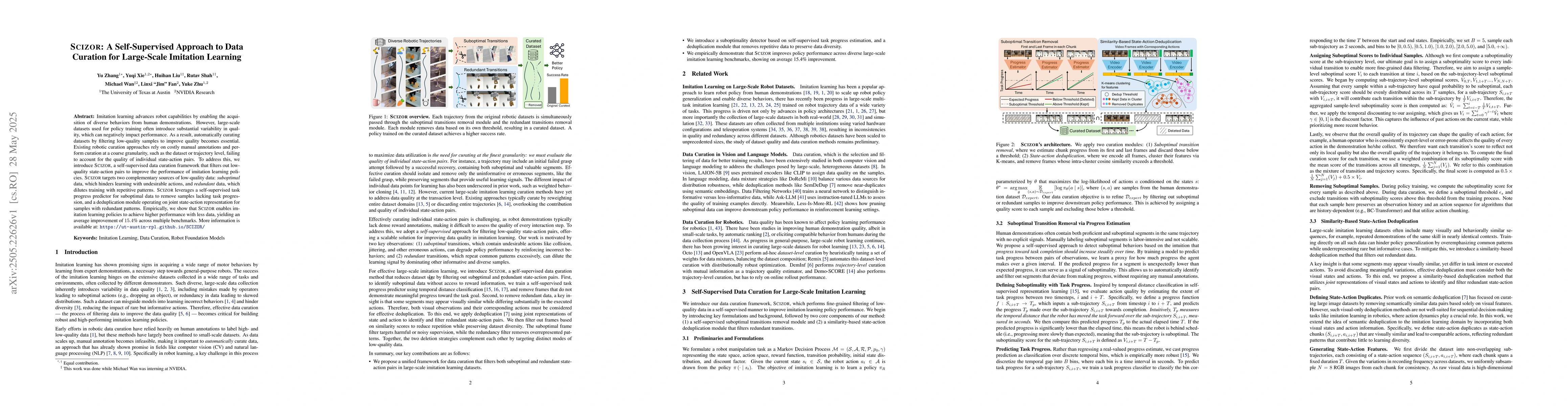The research introduces SCIZOR, a self-supervised data curation framework for large-scale imitation learning that filters out low-quality state-action pairs, targeting suboptimal and redundant data sources using a task progress predictor and a deduplication module.
