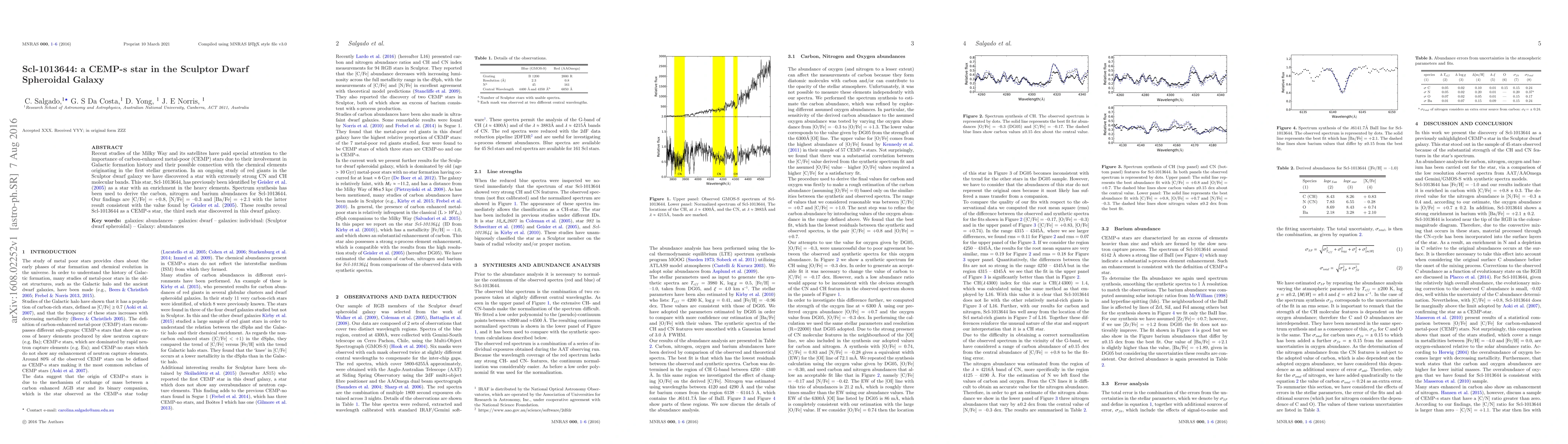 Recent studies of the Milky Way and its satellites have paid special attention to the importance of carbon-enhanced metal-poor (CEMP) stars due to their involvement in Galactic formation history and their possible connection with the chemical elements originating in the first stellar generation. In an ongoing study of red giants in the Sculptor dwarf galaxy we have discovered a star with extremely strong CN and CH molecular bands. This star, Scl-1013644, has previously been identified by Geisler et al. (2005) as a star with an enrichment in the heavy elements. Spectrum synthesis has been used to derive the carbon, nitrogen and barium abundances for Scl-1013644. Our findings are [C/Fe] = +0.8, [N/Fe] = -0.3 and [Ba/Fe] = +2.1 with the latter result consistent with the value found by Geisler et al. (2005). These results reveal Scl-1013644 as a CEMP-s star, the third such star discovered in this dwarf galaxy.