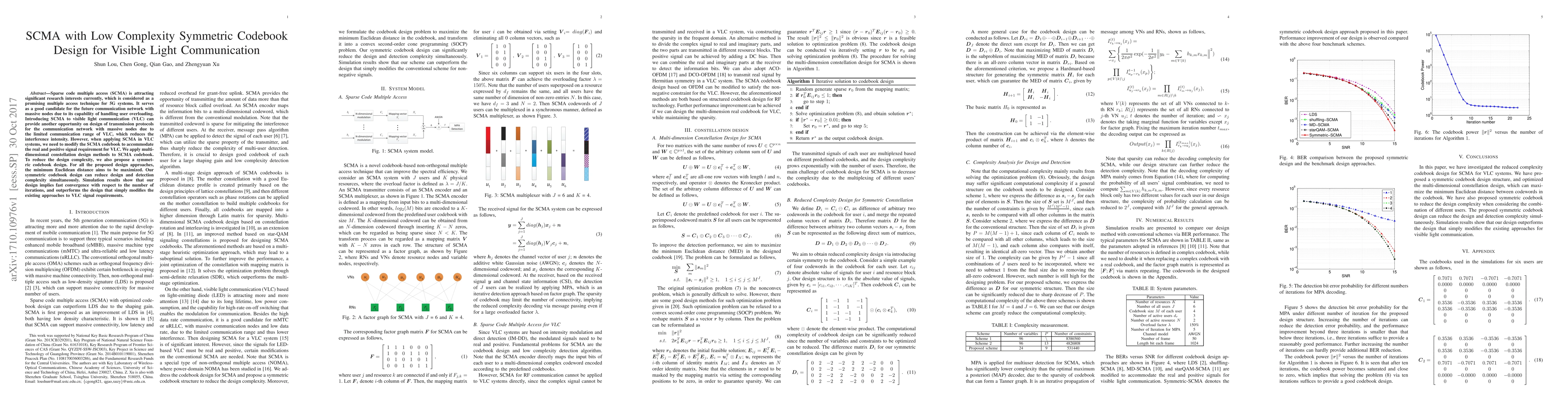 Sparse code multiple access (SCMA) is attracting significant research interests currently, which is considered as a promising multiple access technique for 5G systems. It serves as a good candidate for the future communication network with massive nodes due to its capability of handling user overloading. Introducing SCMA to visible light communication (VLC) can provide another opportunity on design of transmission protocols for the communication network with massive nodes due to the limited communication range of VLC, which reduces the interference intensity. However, when applying SCMA in VLC systems, we need to modify the SCMA codebook to accommodate the real and positive signal requirement for VLC.We apply multidimensional constellation design methods to SCMA codebook. To reduce the design complexity, we also propose a symmetric codebook design. For all the proposed design approaches, the minimum Euclidean distance aims to be maximized. Our symmetric codebook design can reduce design and detection complexity simultaneously. Simulation results show that our design implies fast convergence with respect to the number of iterations, and outperforms the design that simply modifies the existing approaches to VLC signal requirements.