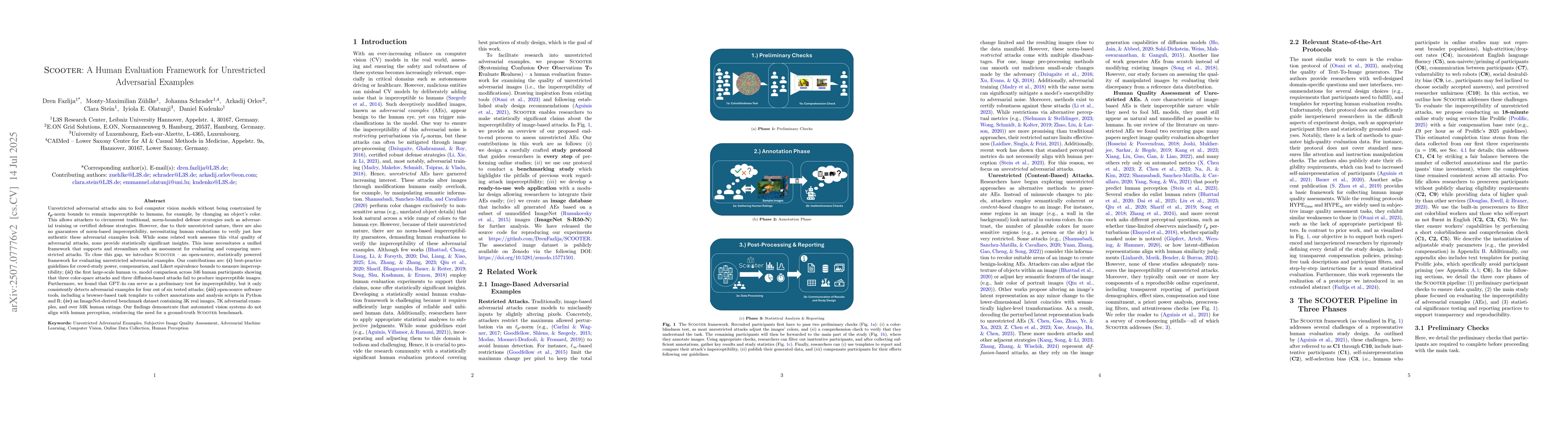 Unrestricted adversarial attacks aim to fool computer vision models without being constrained by $\ell_p$-norm bounds to remain imperceptible to humans, for example, by changing an object's color. This allows attackers to circumvent traditional, norm-bounded defense strategies such as adversarial training or certified defense strategies. However, due to their unrestricted nature, there are also no guarantees of norm-based imperceptibility, necessitating human evaluations to verify just how authentic these adversarial examples look. While some related work assesses this vital quality of adversarial attacks, none provide statistically significant insights. This issue necessitates a unified framework that supports and streamlines such an assessment for evaluating and comparing unrestricted attacks. To close this gap, we introduce SCOOTER - an open-source, statistically powered framework for evaluating unrestricted adversarial examples. Our contributions are: $(i)$ best-practice guidelines for crowd-study power, compensation, and Likert equivalence bounds to measure imperceptibility; $(ii)$ the first large-scale human vs. model comparison across 346 human participants showing that three color-space attacks and three diffusion-based attacks fail to produce imperceptible images. Furthermore, we found that GPT-4o can serve as a preliminary test for imperceptibility, but it only consistently detects adversarial examples for four out of six tested attacks; $(iii)$ open-source software tools, including a browser-based task template to collect annotations and analysis scripts in Python and R; $(iv)$ an ImageNet-derived benchmark dataset containing 3K real images, 7K adversarial examples, and over 34K human ratings. Our findings demonstrate that automated vision systems do not align with human perception, reinforcing the need for a ground-truth SCOOTER benchmark.