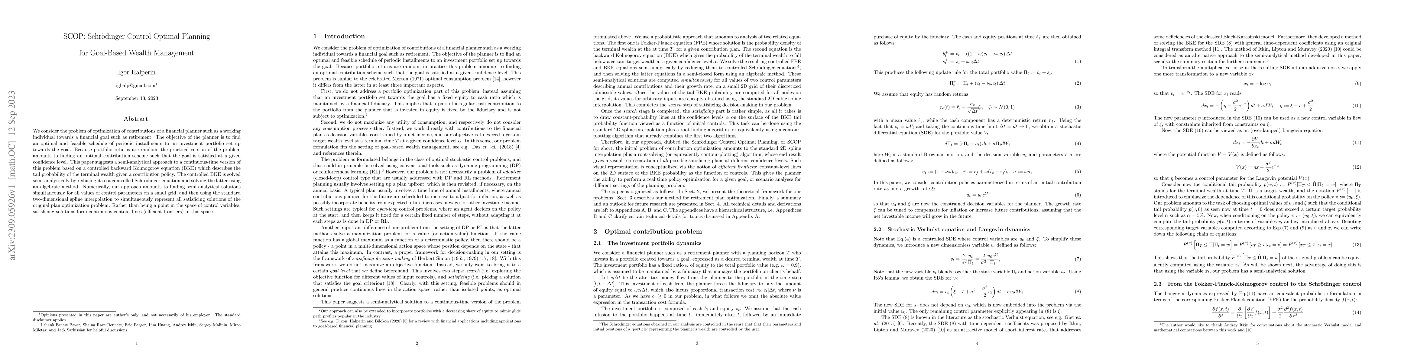 This paper proposes a semi-analytical method for optimal wealth management planning using Schrodinger Control Optimal Planning (SCOP). It solves a controlled backward Kolmogorov equation by transforming it into a controlled Schrodinger equation, providing continuous contour lines (efficient frontiers) for optimal contribution schedules.