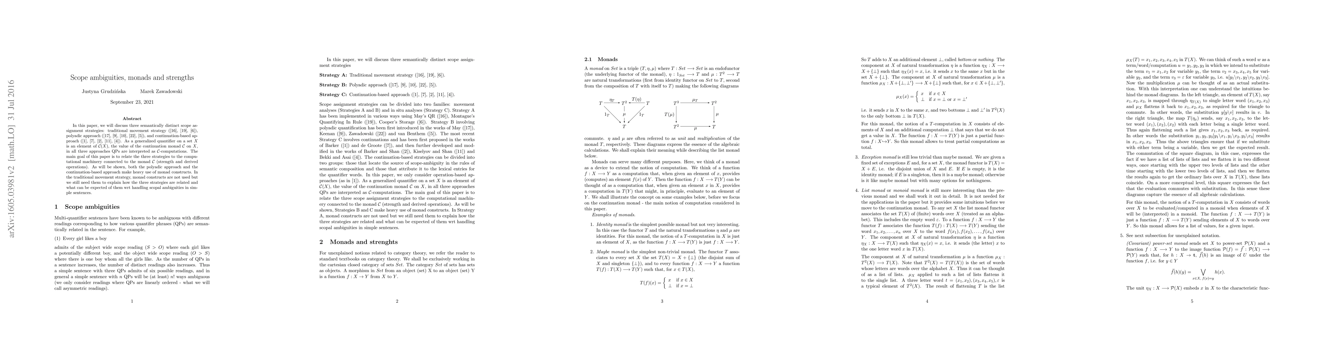 In this paper, we will discuss three semantically distinct scope assignment strategies: traditional movement strategy, polyadic approach, and continuation-based approach. As a generalized quantifier on a set X is an element of C(X), the value of continuation monad C on X, in all three approaches QPs are interpreted as C-computations. The main goal of this paper is to relate the three strategies to the computational machinery connected to the monad C (strength and derived operations). As will be shown, both the polyadic approach and the continuation-based approach make heavy use of monad constructs. In the traditional movement strategy, monad constructs are not used but we still need them to explain how the three strategies are related and what can be expected of them wrt handling scopal ambiguities in simple sentences.