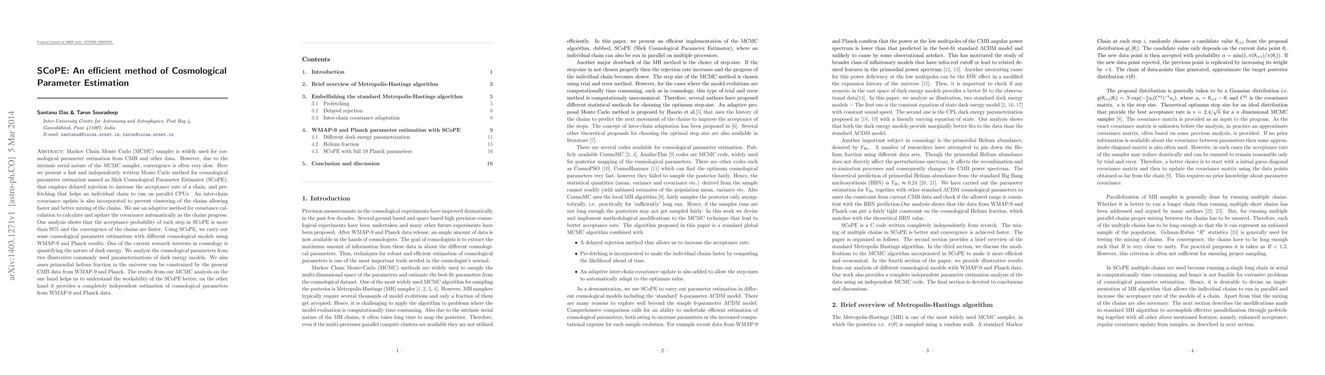 SCoPE is a novel Monte Carlo method for faster cosmological parameter estimation using delayed rejection and parallel processing, achieving over 95% acceptance probability and significantly faster convergence compared to traditional MCMC. It also incorporates inter-chain covariance updates and adaptive covariance calculation for better mixing and accuracy in estimating parameters from WMAP-9 and Planck data.