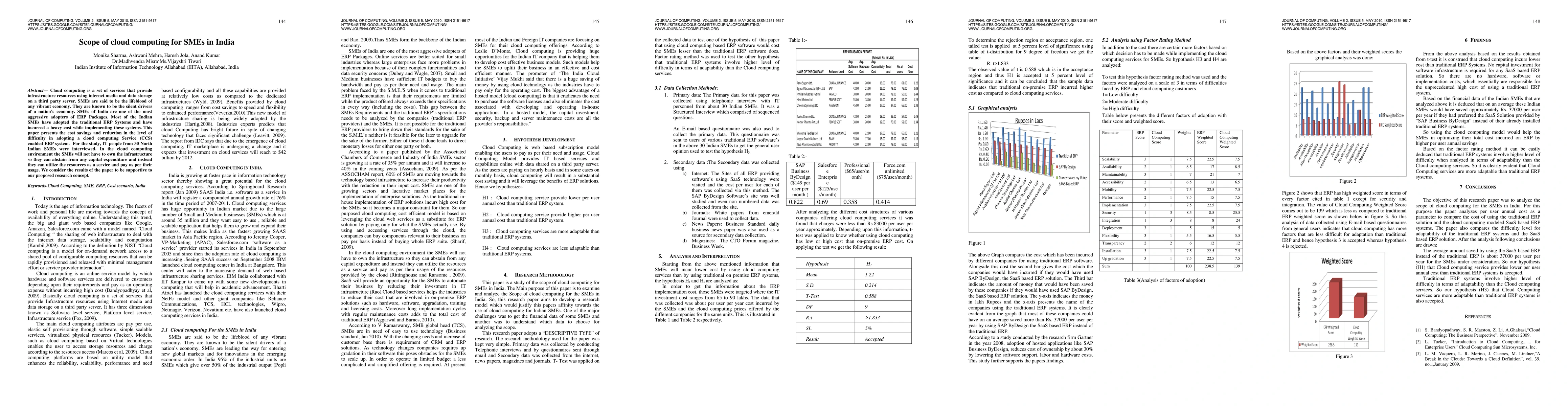 This paper explores the benefits of cloud computing for SMEs in India, highlighting cost savings and reduced implementation difficulty compared to traditional ERP systems. Interviews with IT professionals from 30 North Indian SMEs reveal that cloud services allow for resource utilization without capital expenditure, supporting the potential of cloud-based ERP systems.